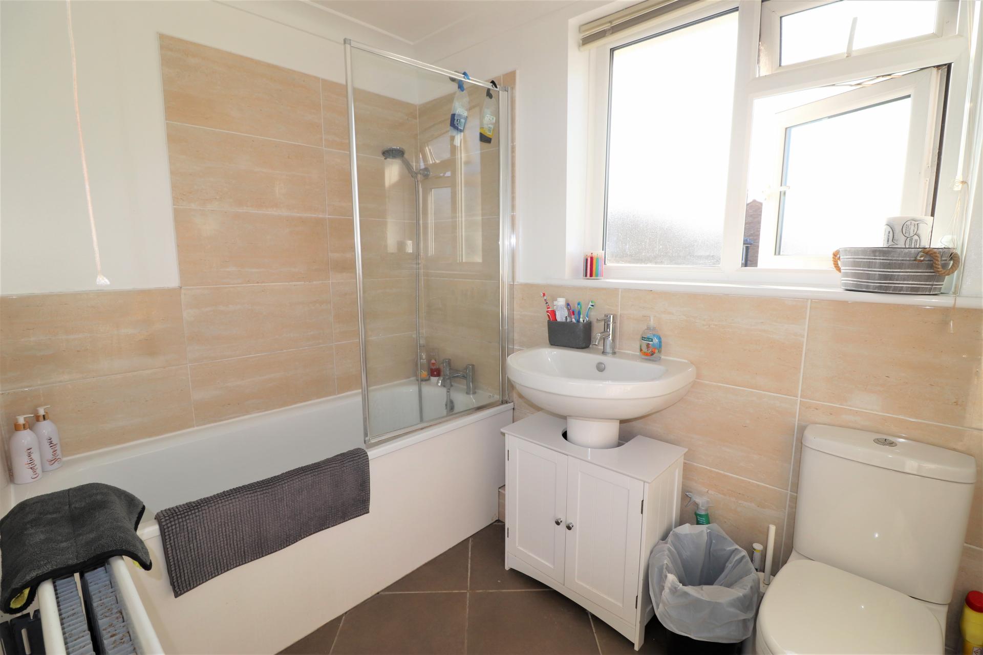 Part tiled with double glazed window to the rear. Panel enclosed bath with mixer tap and wall mounted shower attachment. Pedestal wash hand basin. Low level WC. Double panel radiator.
