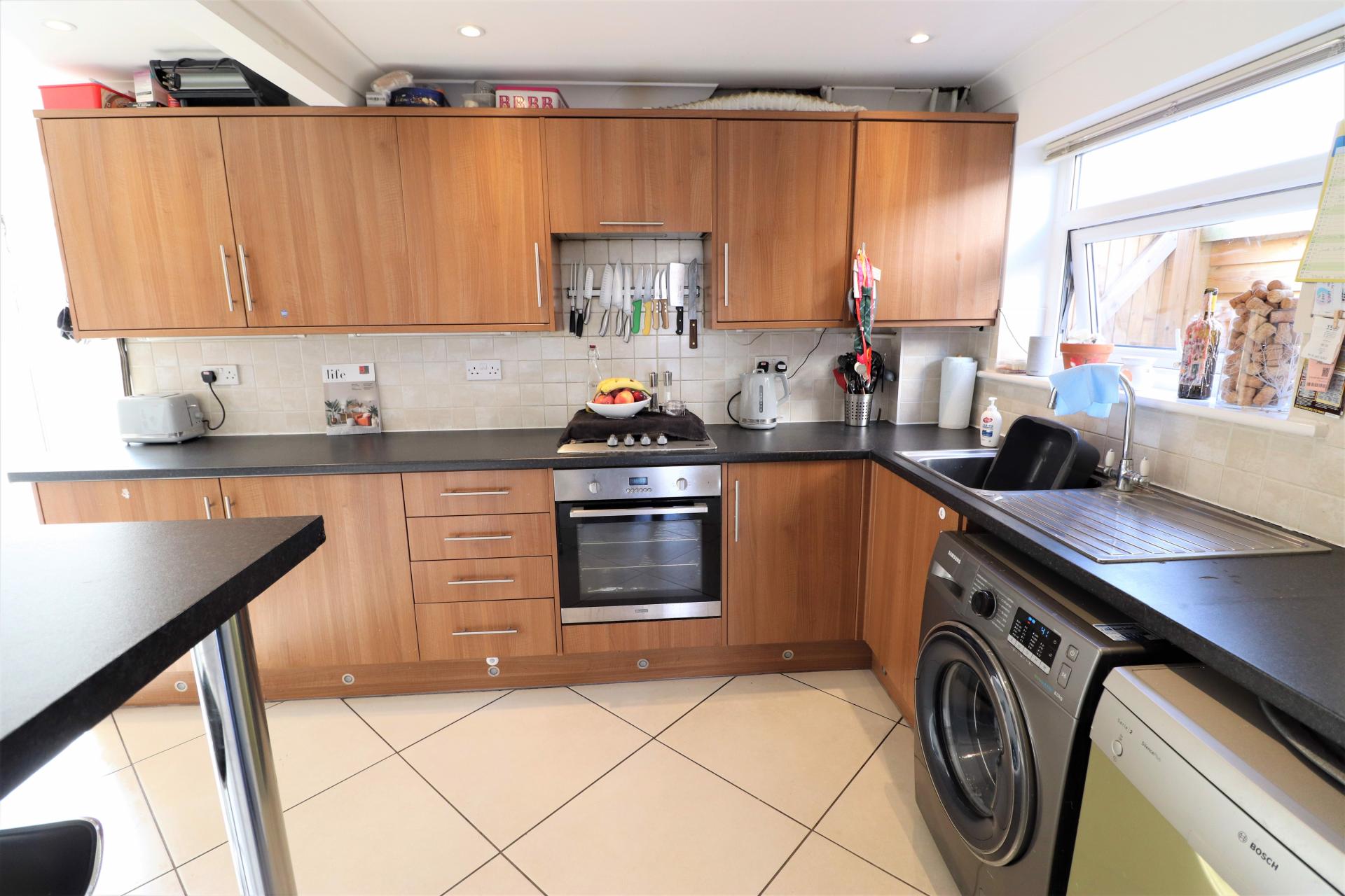 Double glazed window to the side. Roll edge worktops with inset stainless steel, single bowl, single drainer sink unit with mixer tap. Range of base units and drawers with matching wall mounted cupboards. Fitted oven with Four ring gas hob above with an extractor unit over. Space and plumbing for a washing machine and dishwasher. Space for a fridge freezer. Double panel radiator. Inset ceiling spot lights.