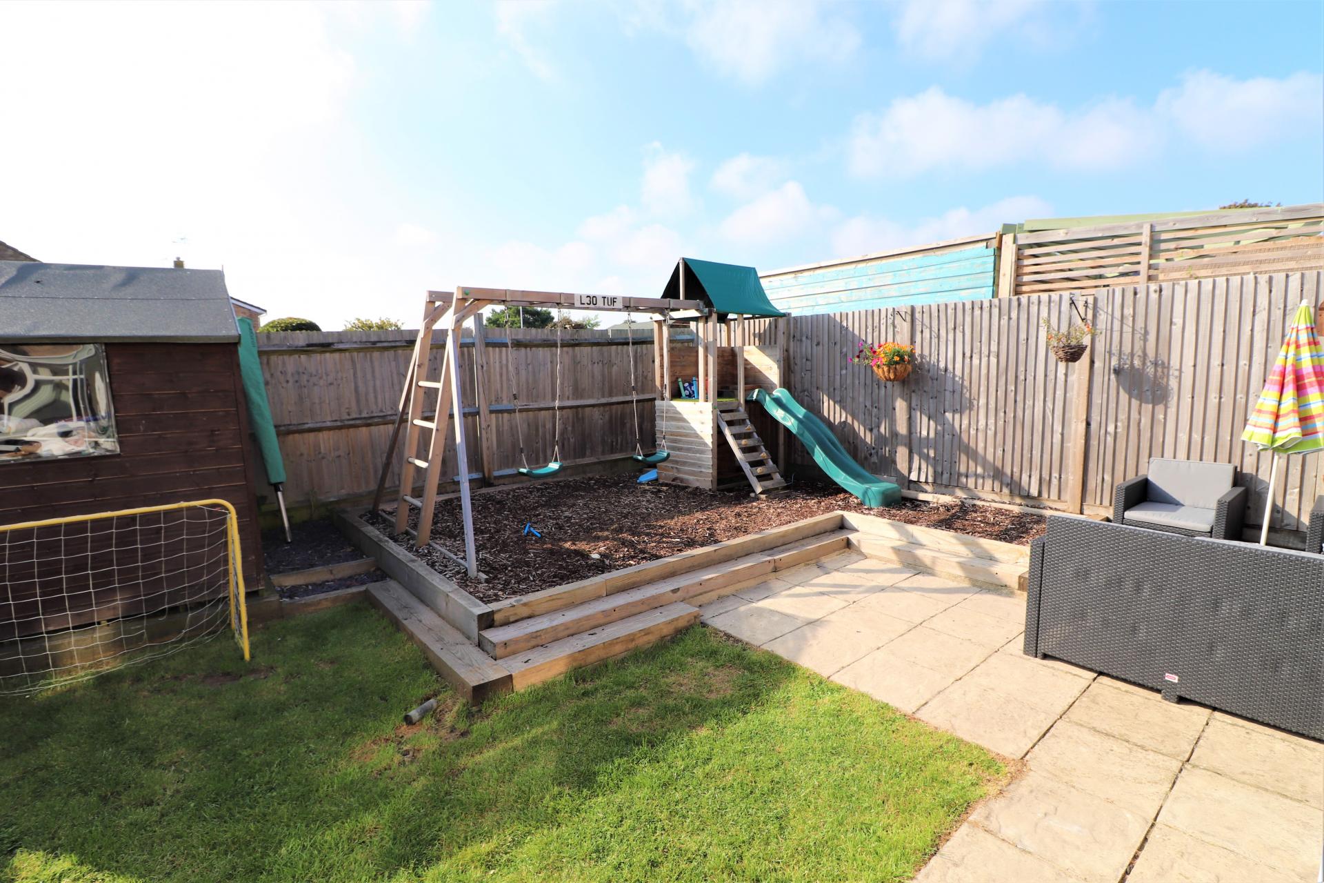 Enclosed and being of a Westerly aspect with an area of lawn. There is also a patio and play area with a secure access from the side.