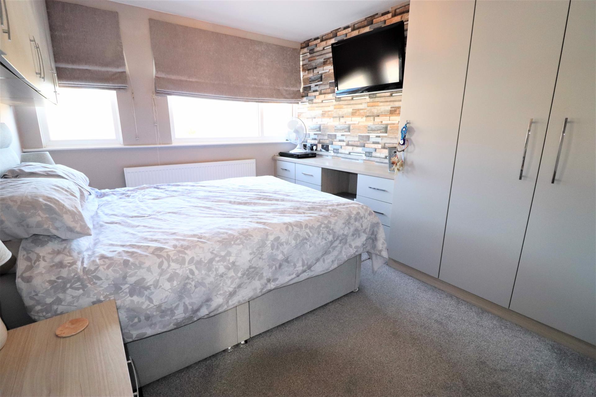 Two double glazed windows to the front. Multiple fitted wardrobes, wall mounted cupboards and drawers. Two bed side cabinets with drawers. Dressing table. Double panel radiator.