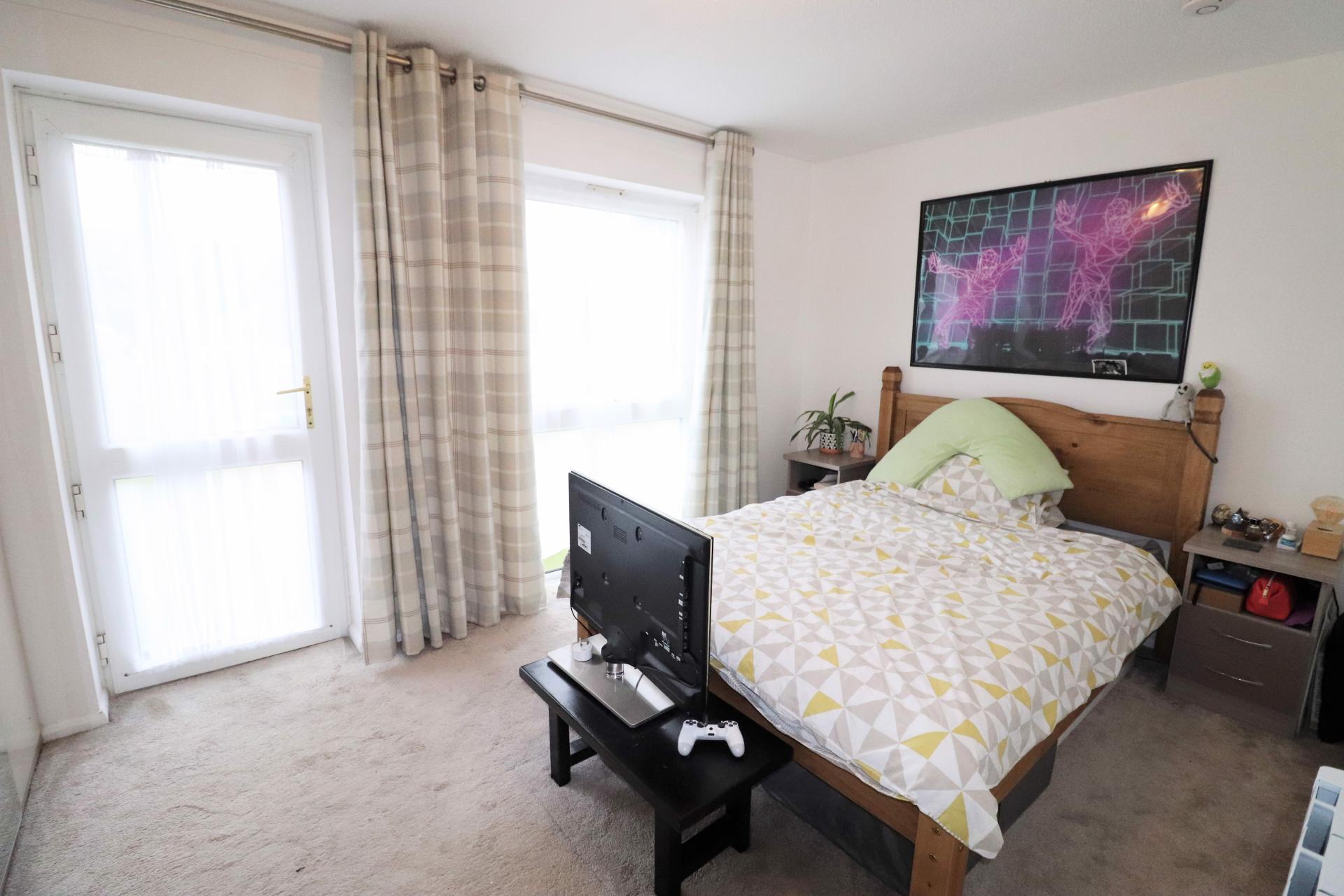 Double glazed door giving access to the rear communal gardens. Double glazed window to the rear. Fitted triple wardrobe with hanging rails and drawers. Wall mounted electric heater. Storage cupboard.