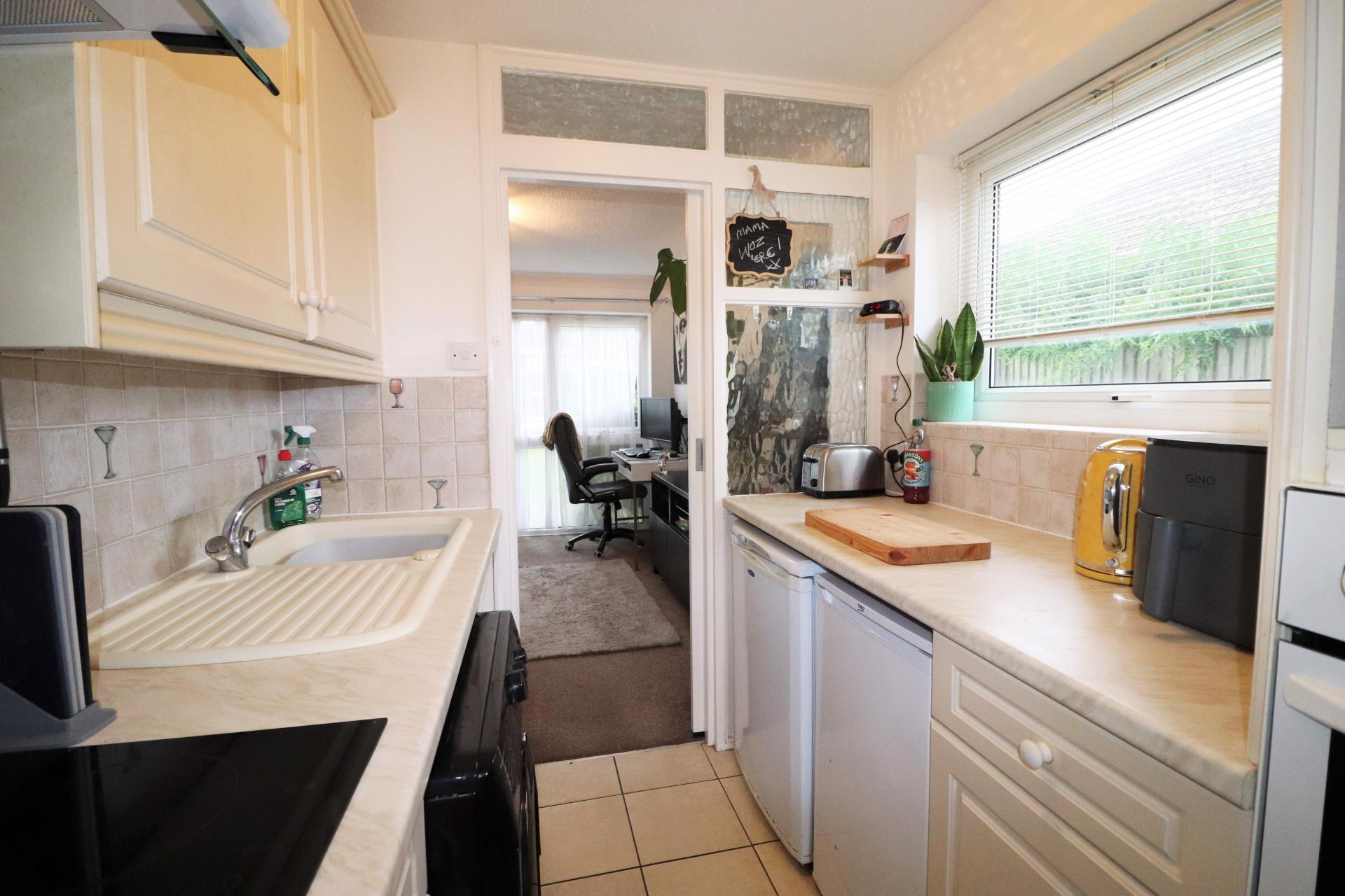 Double glazed window to the side. Roll edge worktops with inset single bowl, single drainer sink unit with mixer tap. Range of base units and drawers with matching wall mounted cupboards. Four ring hob with extractor unit above. Fitted oven with space for microwave over. Spaces for both a fridge and freezer. Space and plumbing for a washing machine.