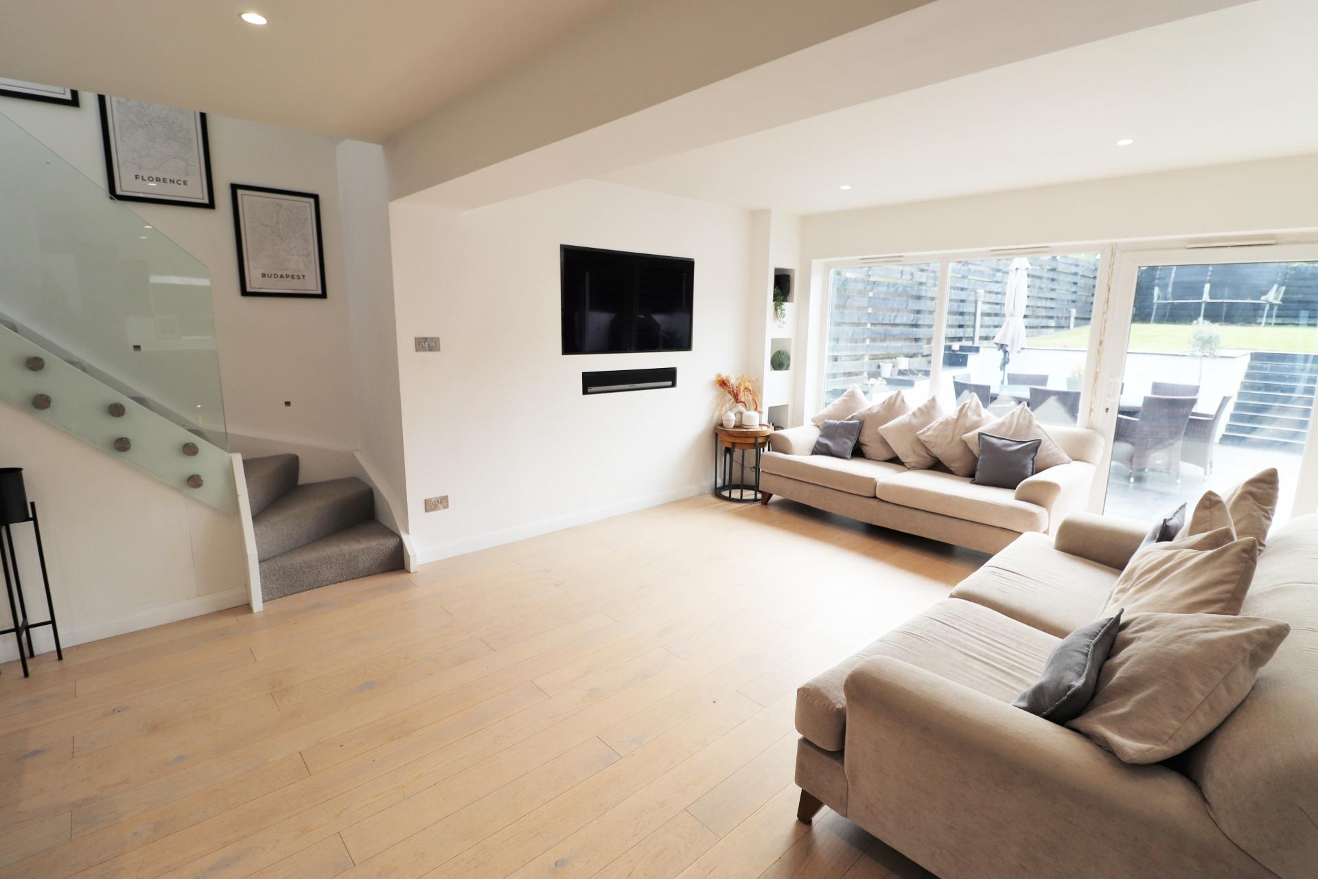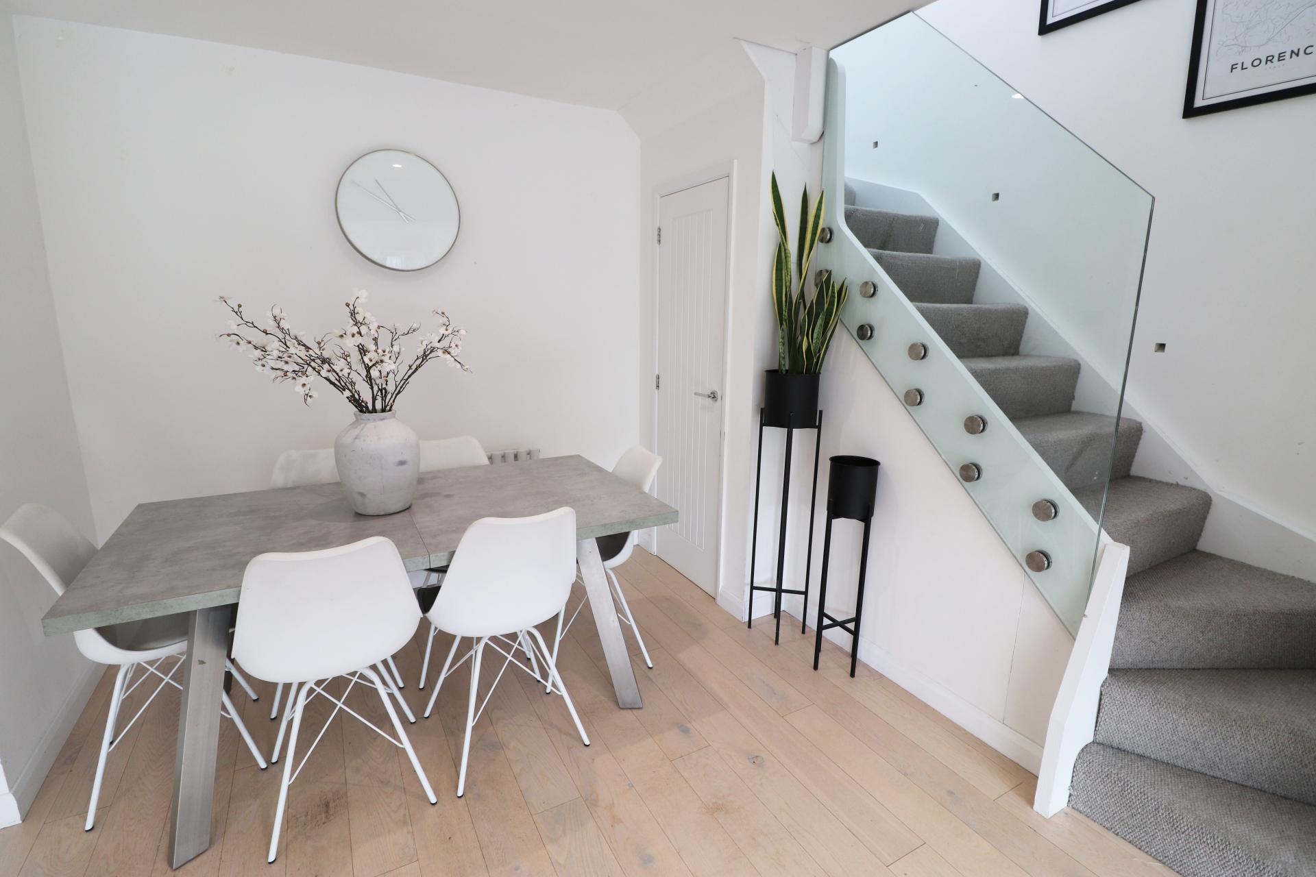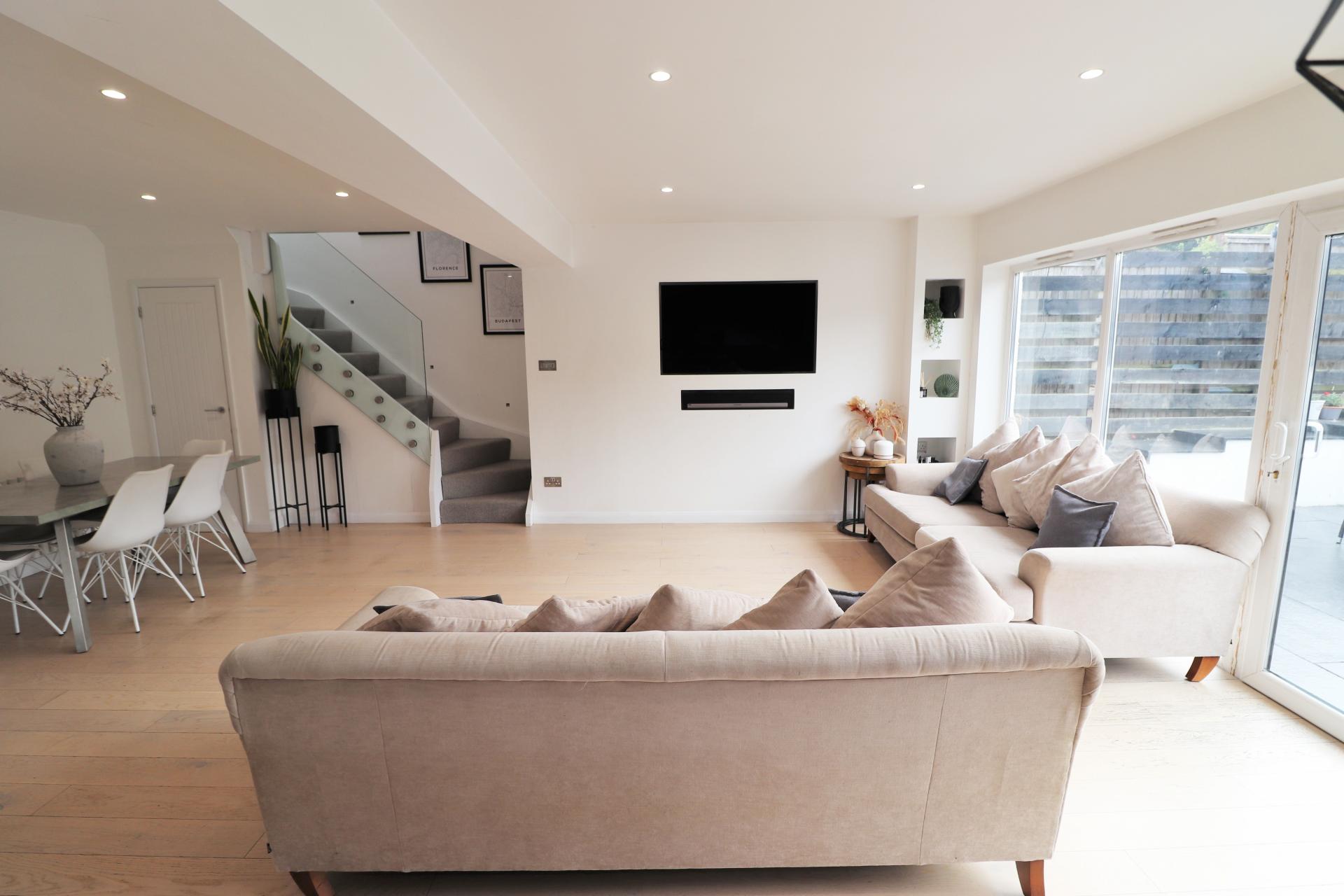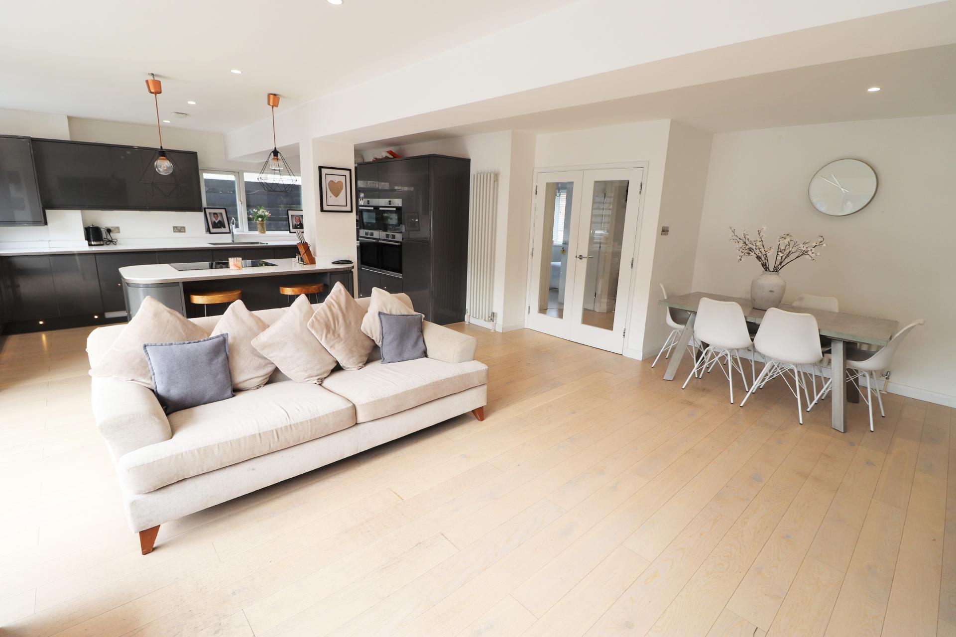 One part of the open plan living space with a double glazed sliding door to the rear garden. Double glazed windows to the rear. Recessed dining space. Two vertical tubular radiators. Under stairs storage cupboard. Inset ceiling spot lights.