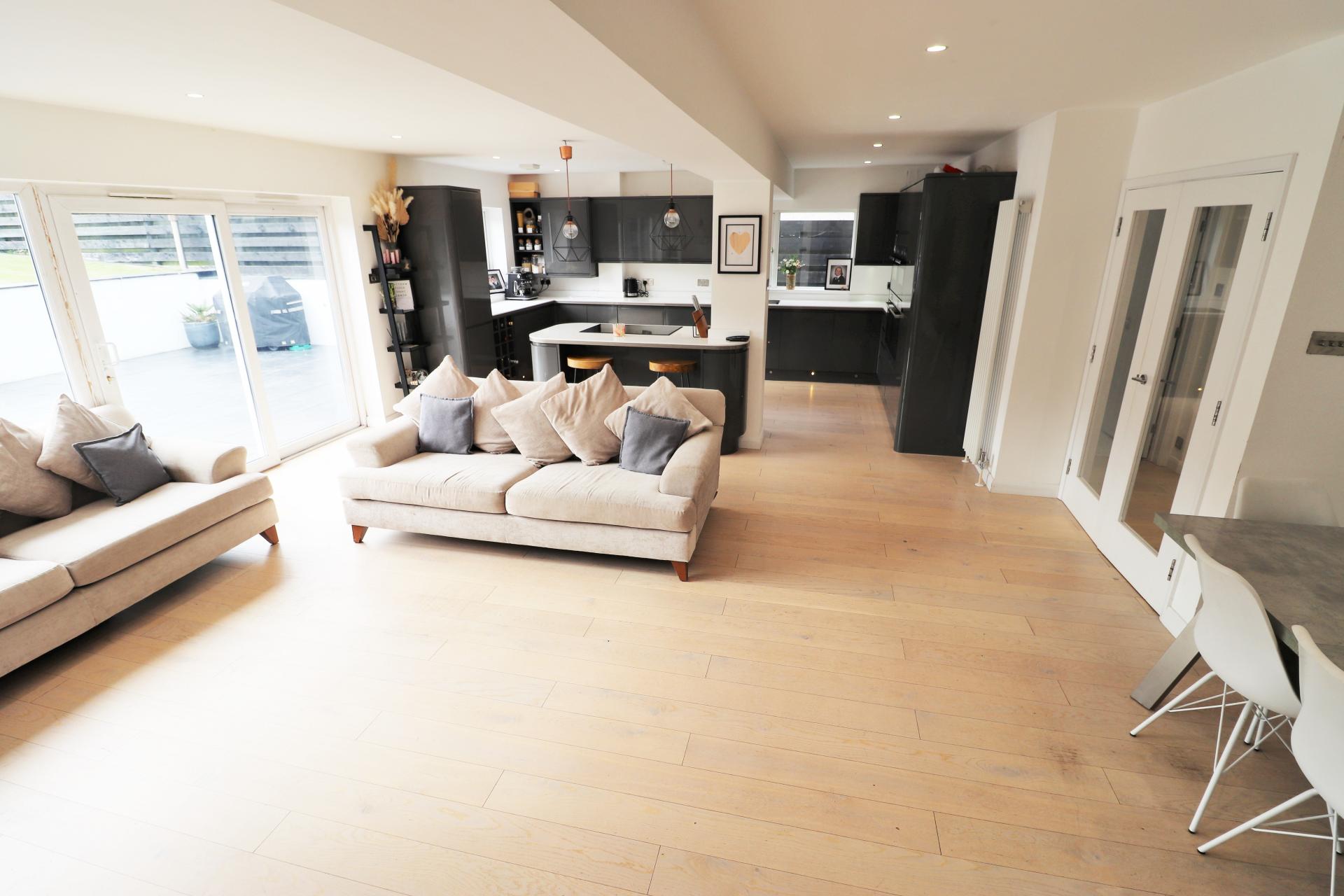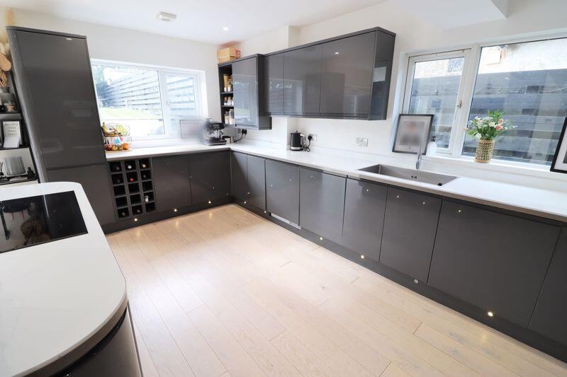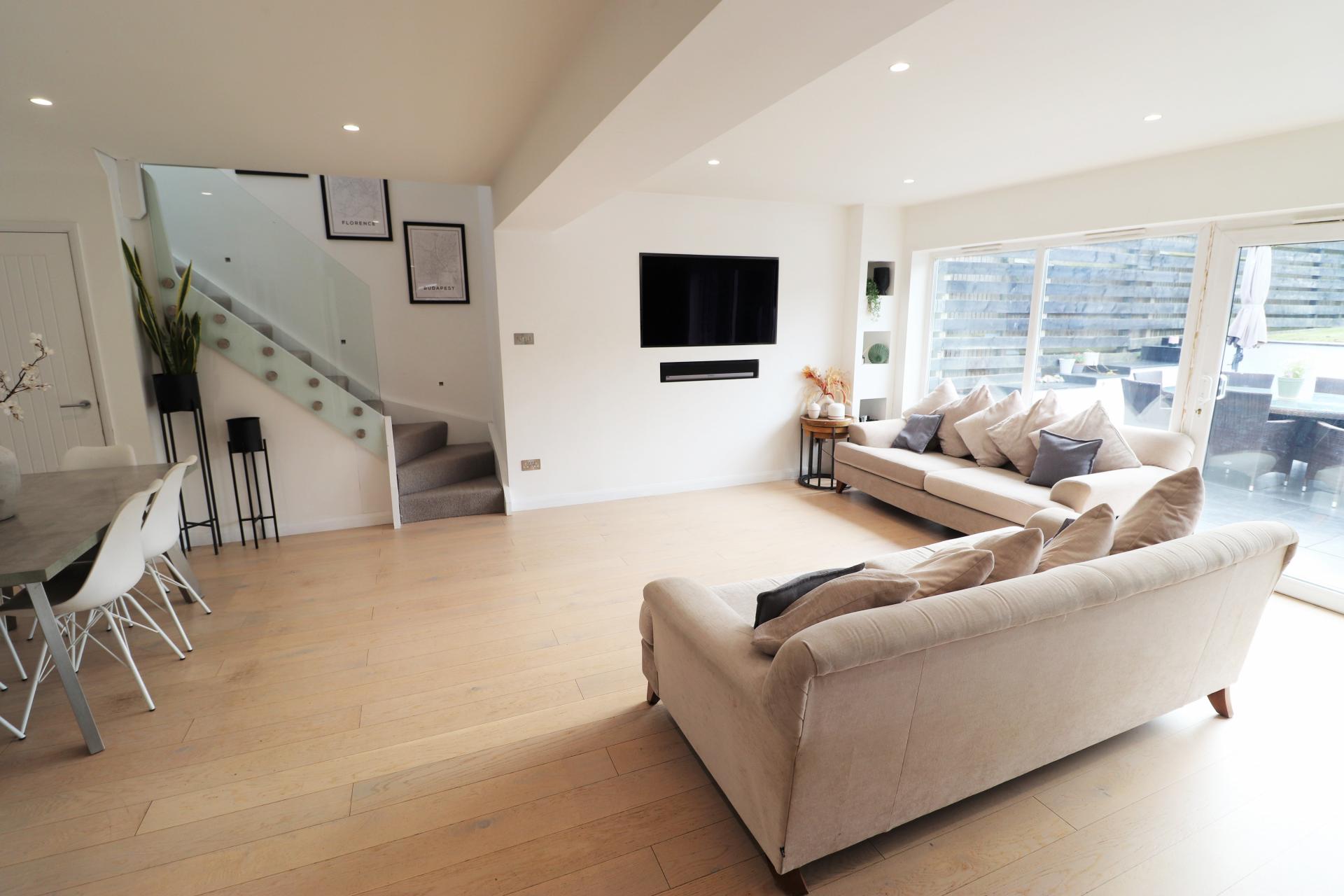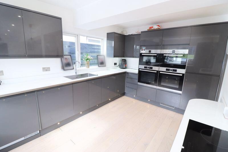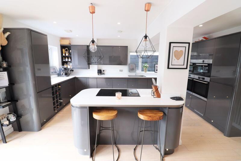 Forming the second part of the open plan living space with double glazed windows to the side and rear. Worktops with a double width sink unit and mixer tap. Range of base units and drawers with matching wall mounted cupboards. Five ring induction hob. Two fitted ovens and microwaves. Integrated Washing machine, dishwasher, tumble dryer and fridge freezer. Wine fridge and rack. Inset ceiling spot lights.