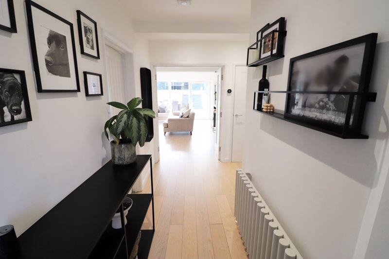 Double glazed front door. Storage cupboard. Tubular Radiator. Inset ceiling spot lights. Double opening glazed doors to the lounge.