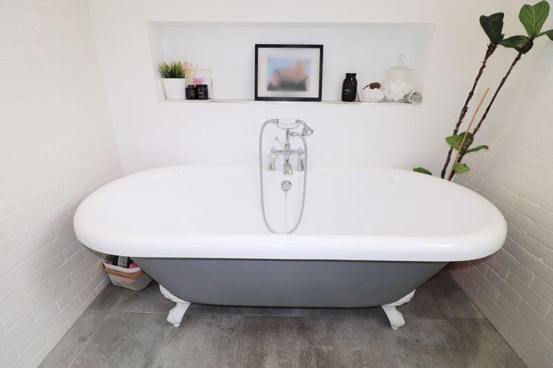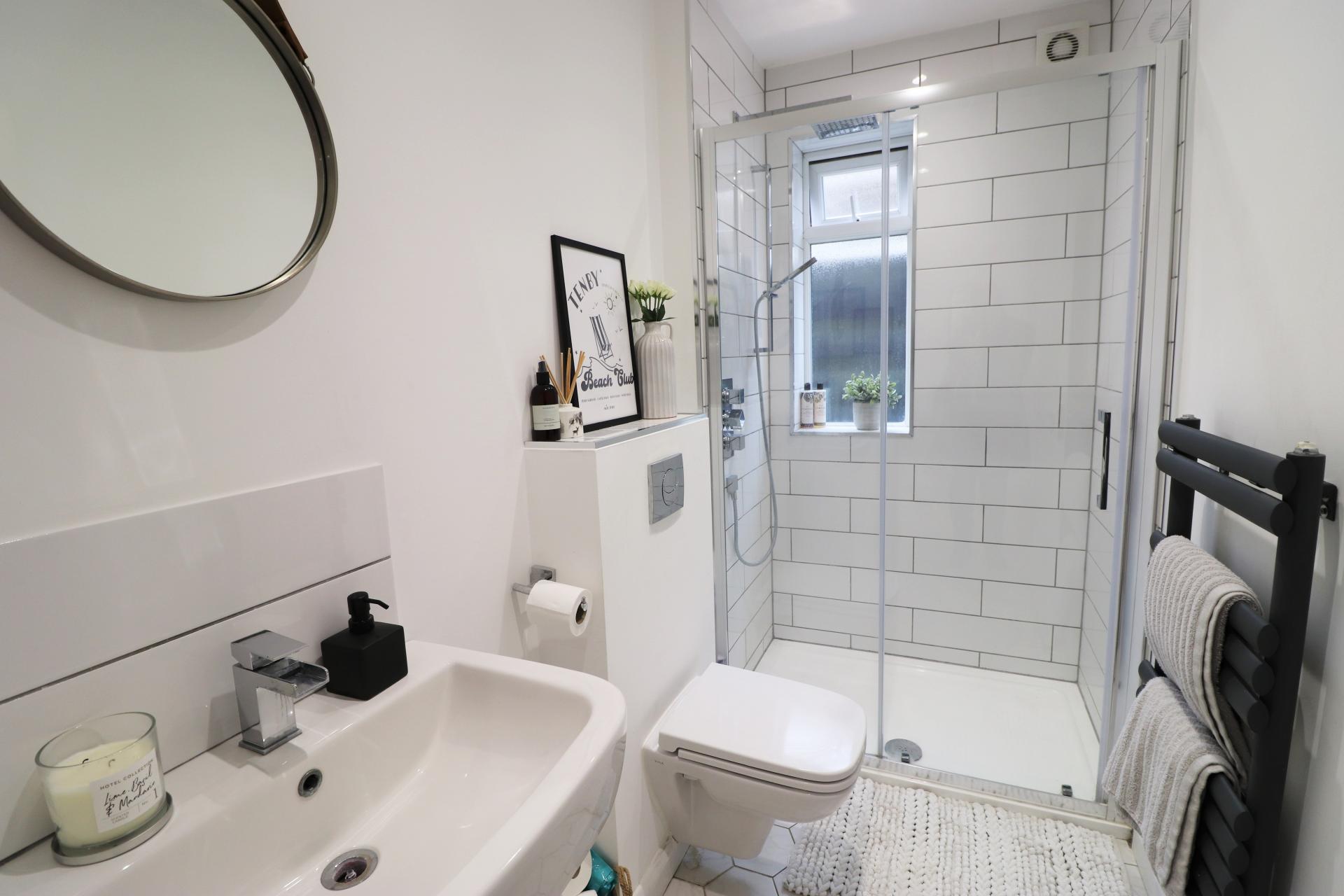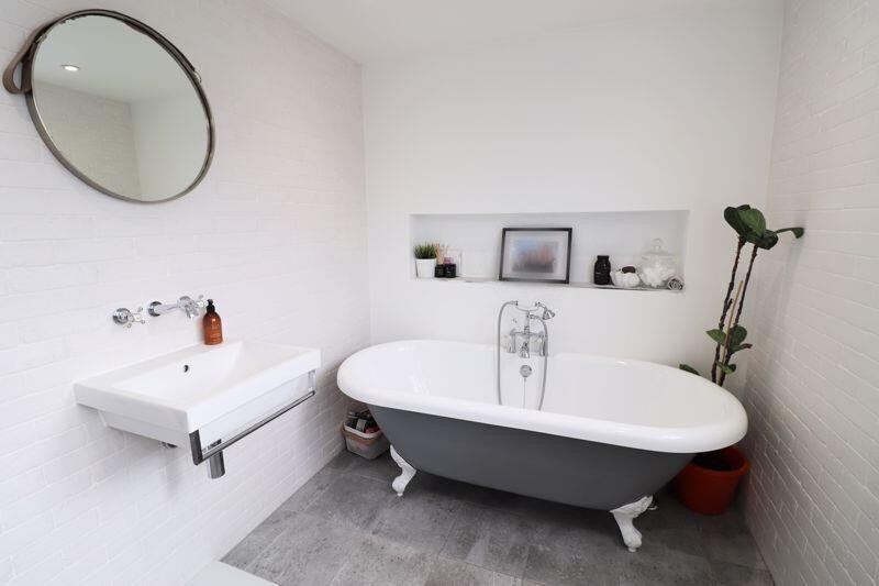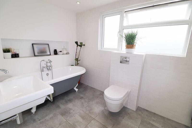Double glazed window to the rear. Roll edge Bath with claw feet and mixer tap with telephone style hand held shower attachment. Walk in double width shower cubicle with rain effect shower and glazed panelling. Low level WC. Wash hand basin.