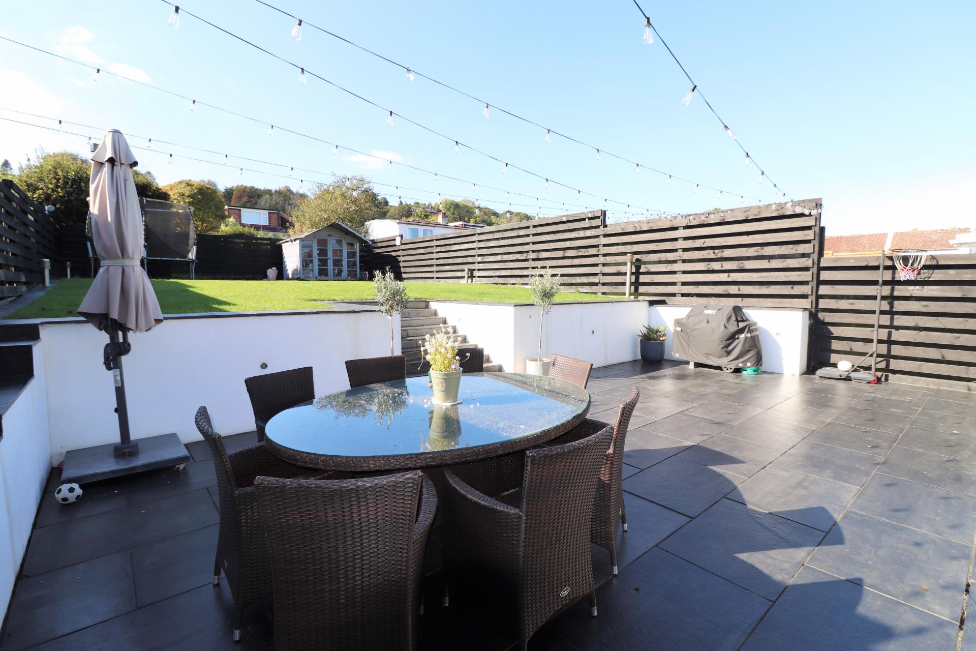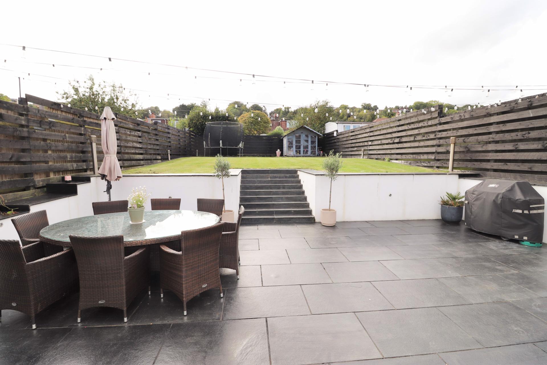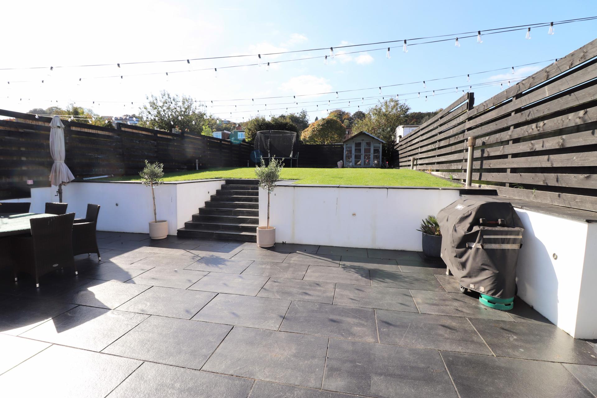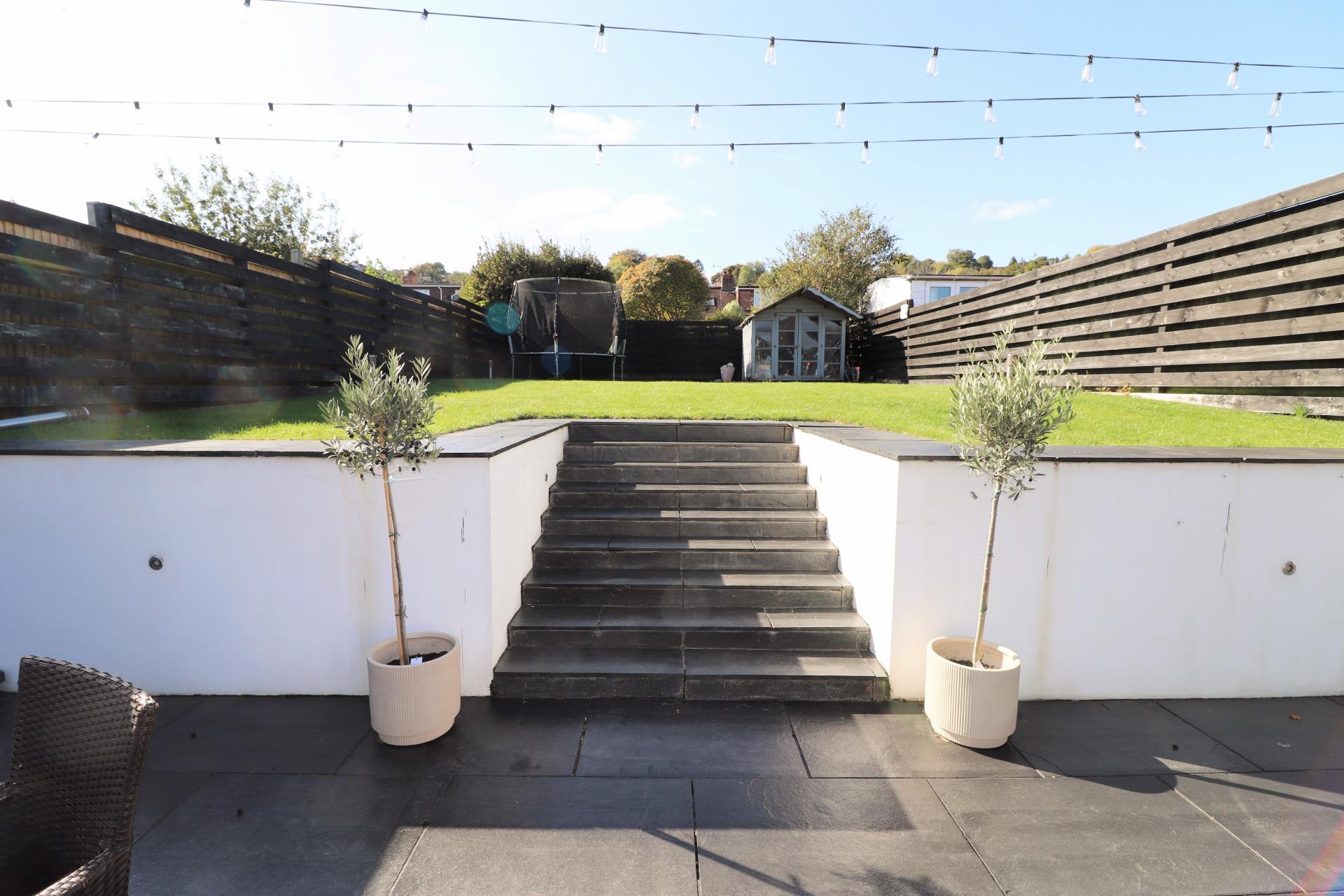 West facing garden which has been landscaped to provide a substantial paved patio area and a raised are of lawn. Side access.