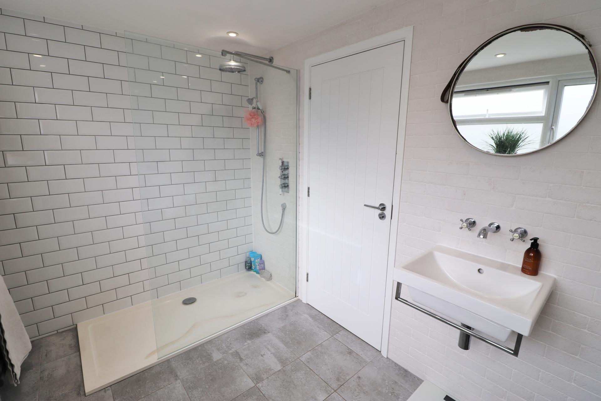 Double glazed window to the side. Walk in double width shower cubicle with rain effect shower head and separate microphone style hand held attachment. Low level WC. Pedestal wash hand basin. Heated towel rail. Inset ceiling spot lights.