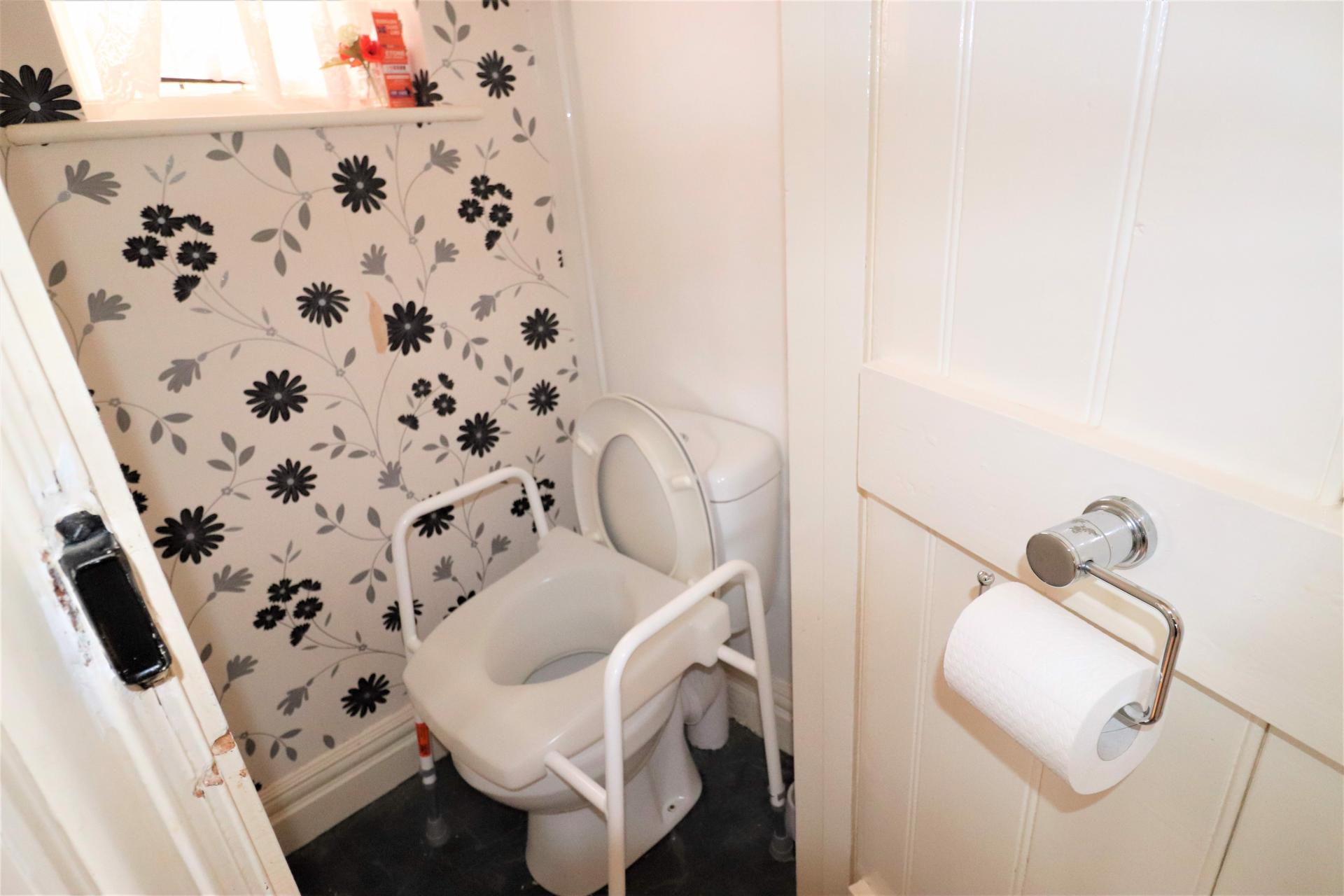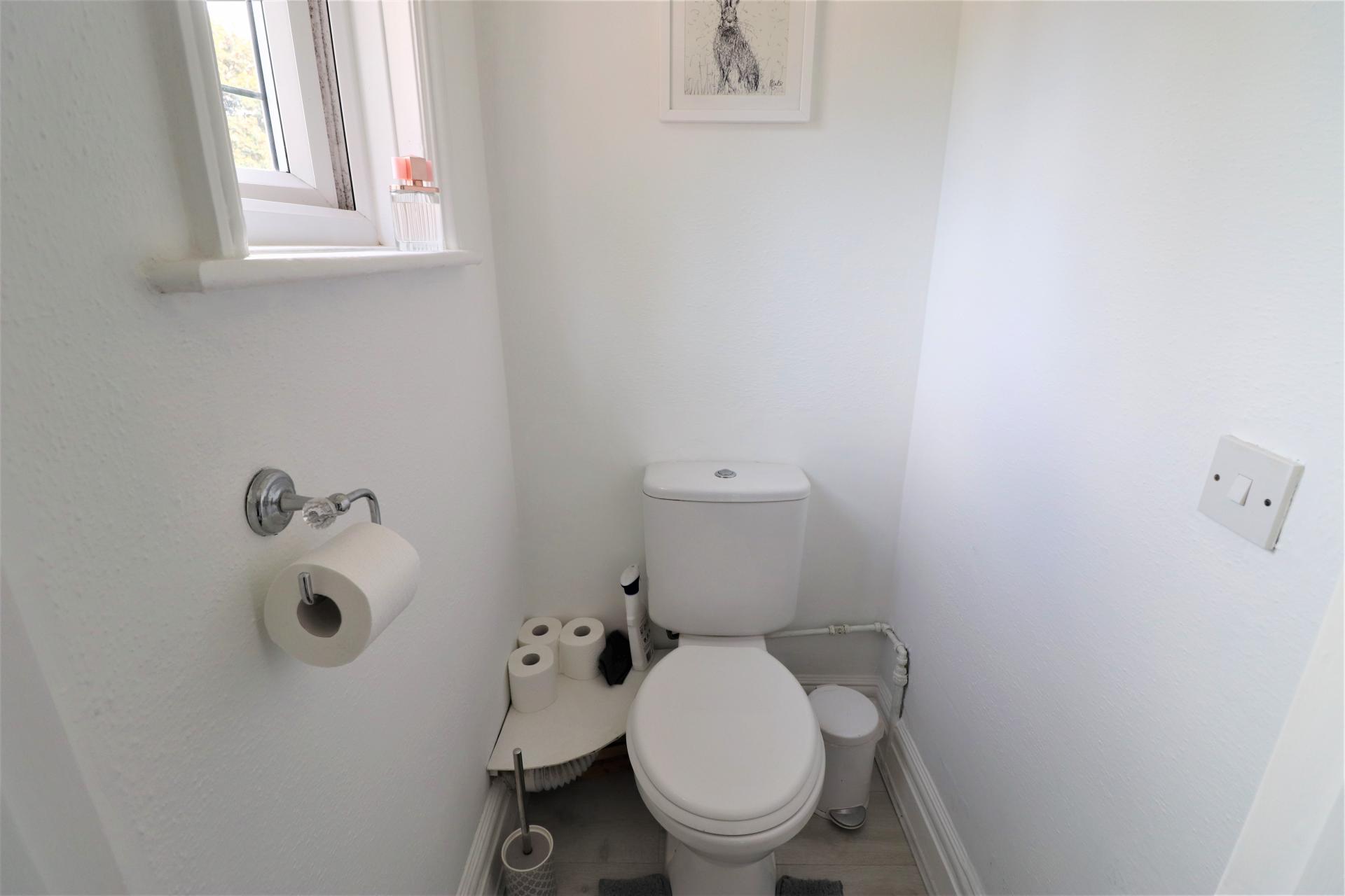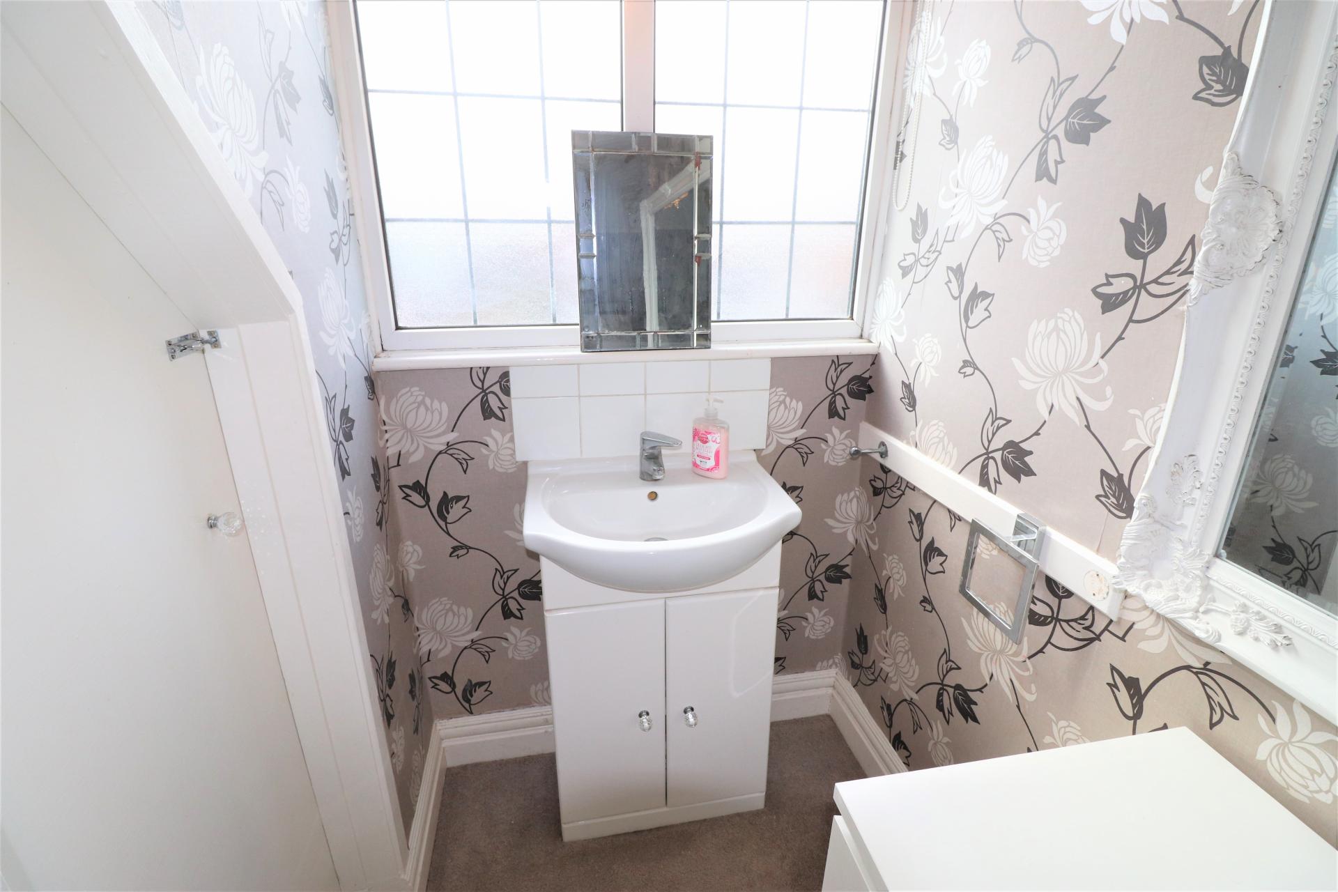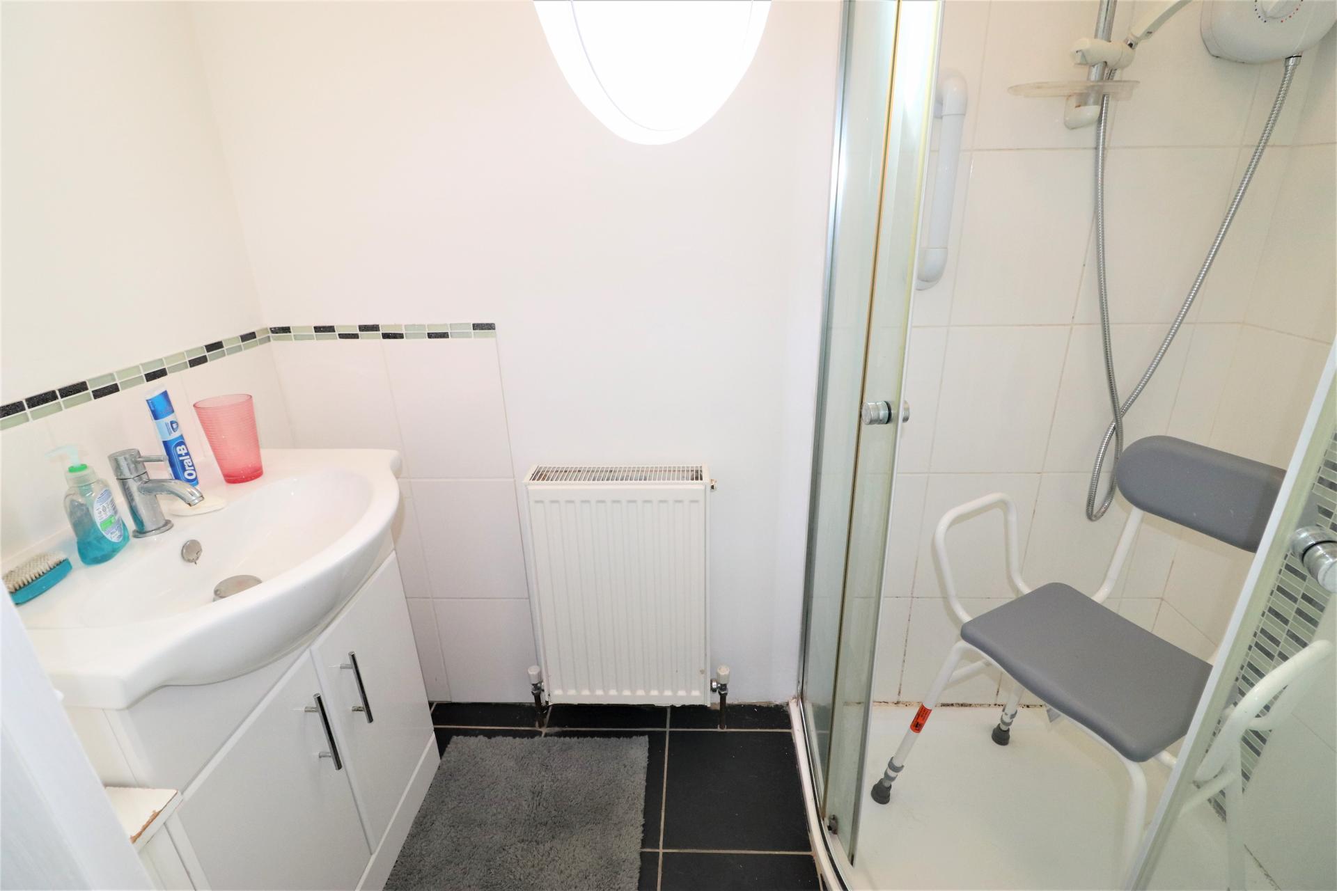 Double glazed, stain glass oval window to the front. Corner shower with wall mounted controls. Wash hand basin with vanity cupboard below. Double panel radiator.