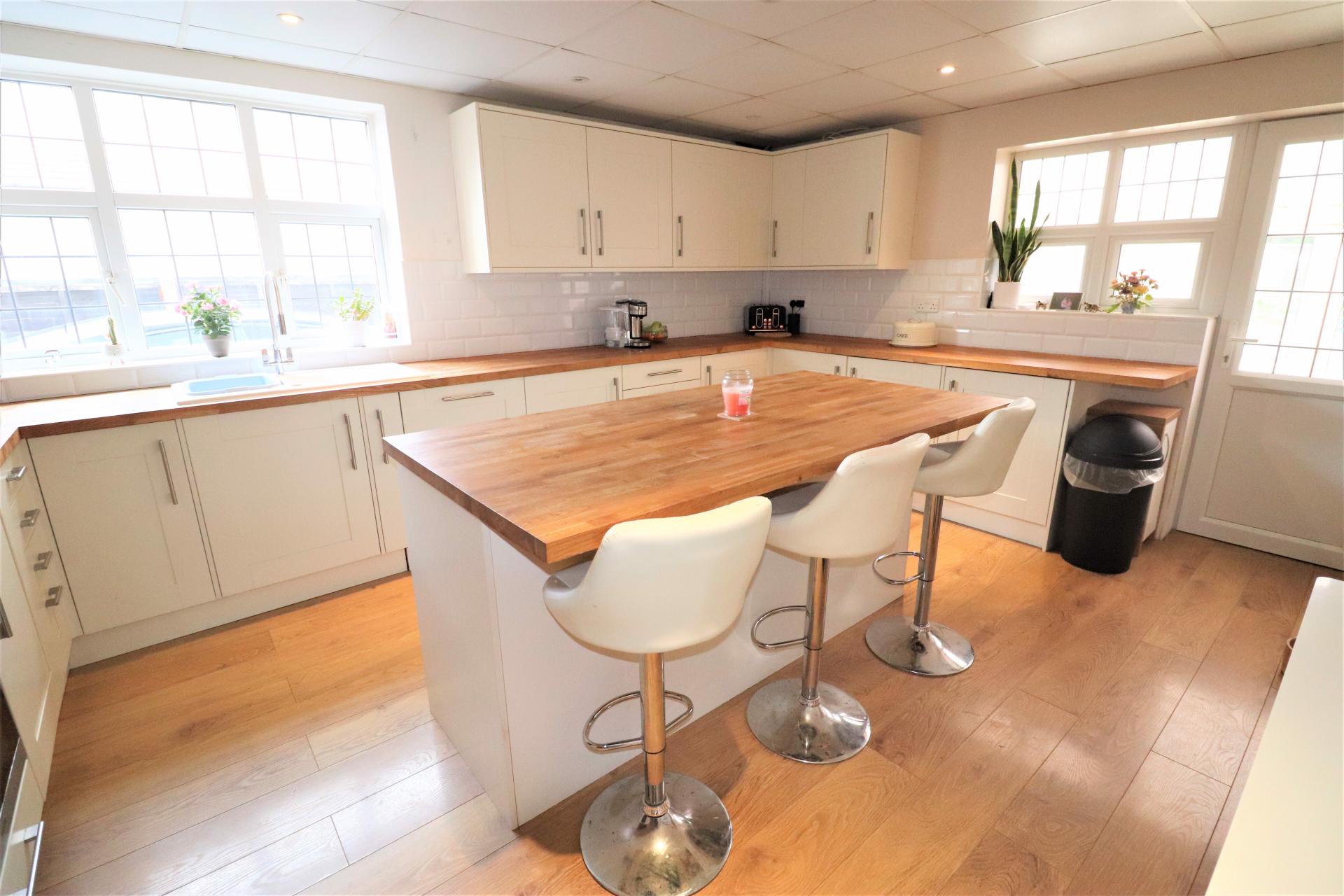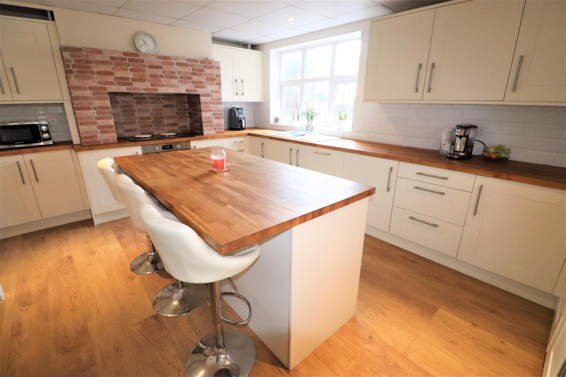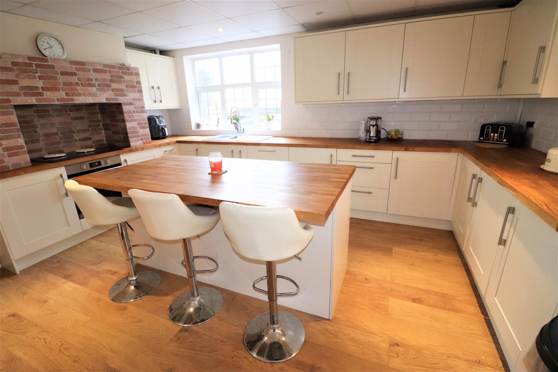 Double glazed, leaded light door to the conservatory. Double glazed, leaded light windows to the side and rear. Wooden worktops with inset one and a half bowl, single drainer sink unit with mixer tap. Range of base units and drawers with matching wall mounted cupboards. Fitted oven with with four ring hob above and extractor unit over with brick effect surround. Integrated dishwasher and two fridges. Feature centre island with cupboards, drawers and breakfast bar. Double panel radiator. Inset ceiling spot lights. Inner hall with under stairs storage space.