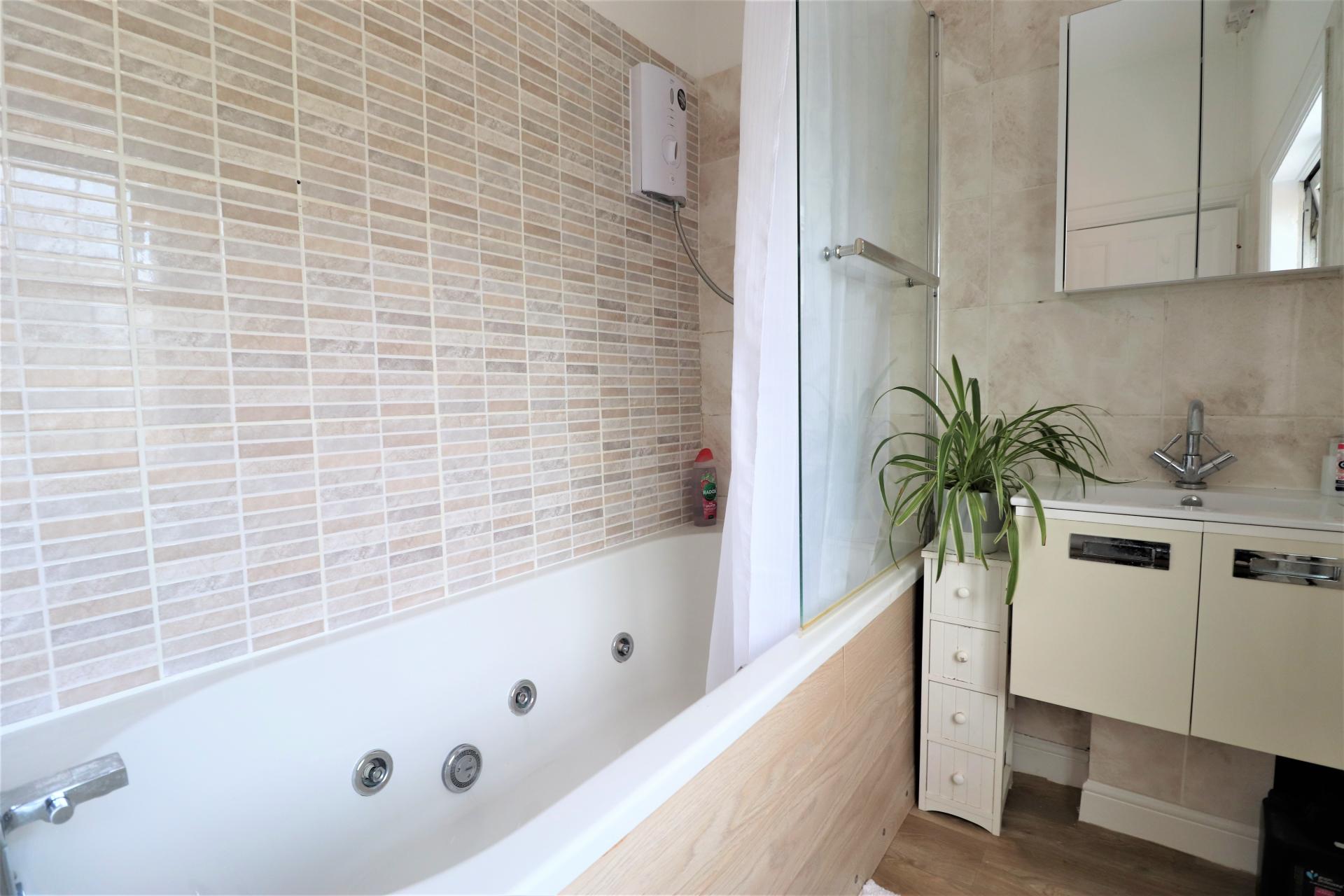Part tiled with a double glazed, leaded light window to the rear. Enclosed jacuzzi bath mixer tap. and wall mounted shower unit over. Wash hand basin with vanity cupboard below. Single panel radiator. Extractor unit.