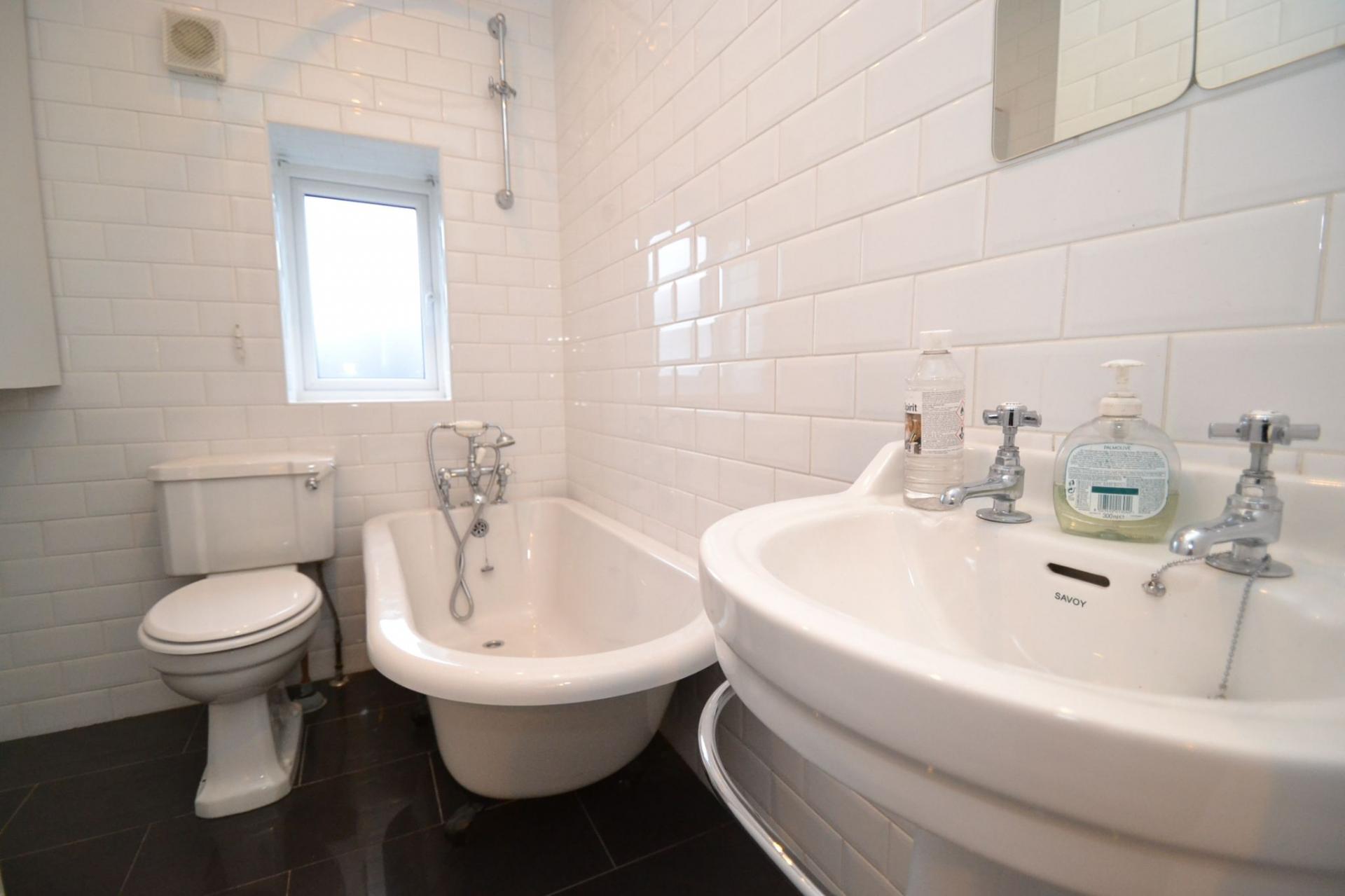 Bathroom: 2.33m x 1.78m (7'7 x 5'10). Three piece suite in white with free standing bath on claw legs, circular chrome shower rail, Edwardian telephone style chrome mixer tap, fully tiled in white brick style, polished tiled floor in slate effect, heated chrome towel rail, frosted Upvc dg window, inset ceiling lights, extractor, cupboard.