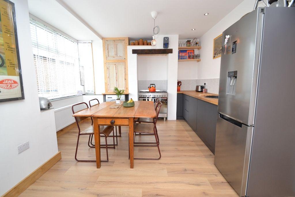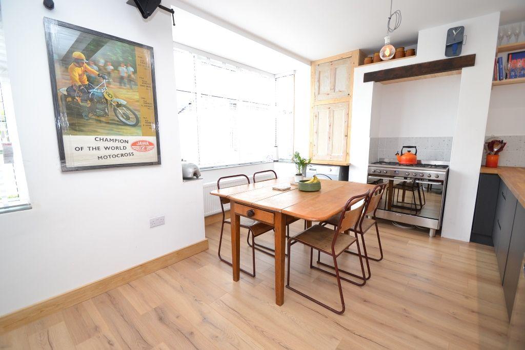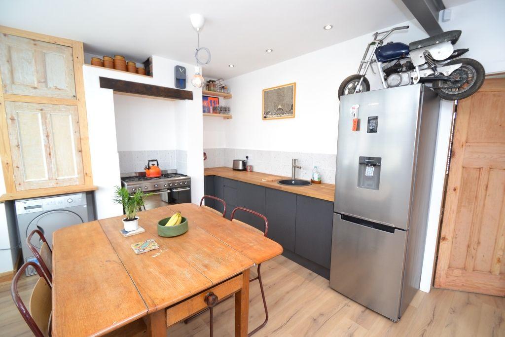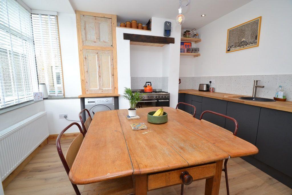 Kitchen Dining Room: 4.80m x 3.08m (15'8 x 10'1). Range of base units with solid butcher work tops, housing for a gas range with a feature oak lintel above, plumbed for an auto-washer, bowl sink, shelving, laminate flooring, ch radiator, side Upvc door, Upvc dg windows to rear with a bay and fitted blinds, space for a good size table and chairs, inset ceiling lights.