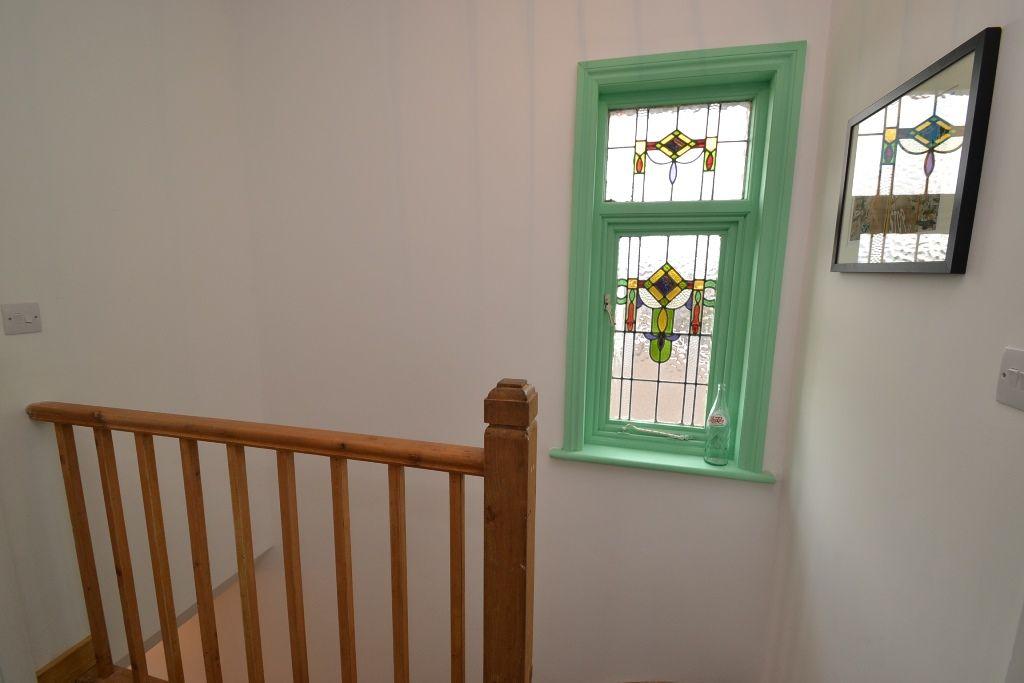 Landing & Stairs: Original coloured side leaded window, access into the roof space.