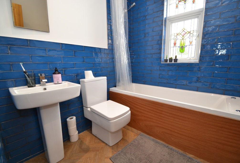 Bathroom: 2.08m x 1.87m (6'10 x 6'1). Three piece Whirlpool air bath suite in white with chrome fittings, mixer shower tap, rail and curtain, attractive retro glazed tiling, heated chrome towel rail, inset ceiling lights, original coloured leaded window, extractor.