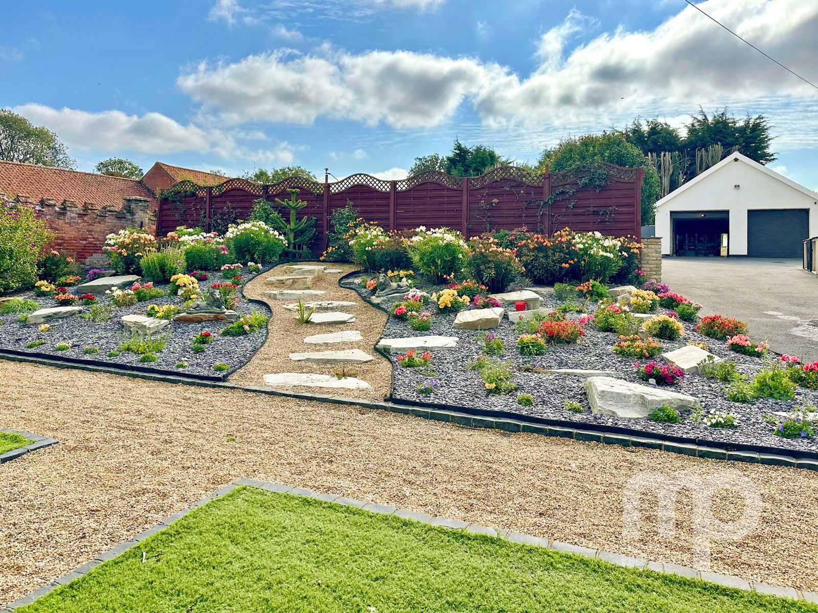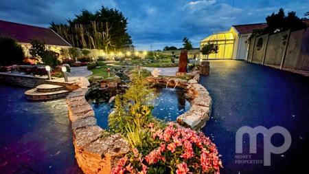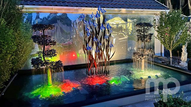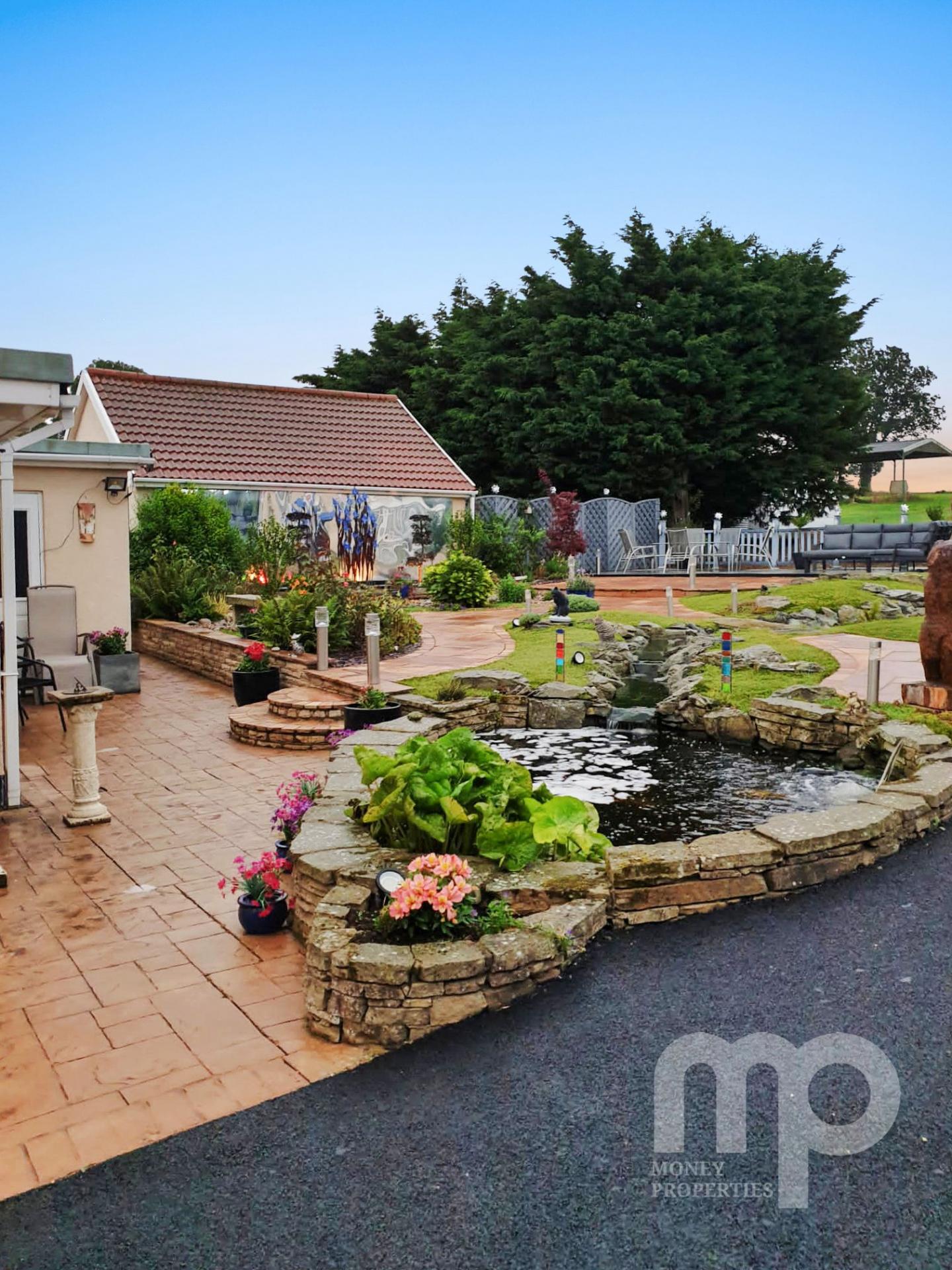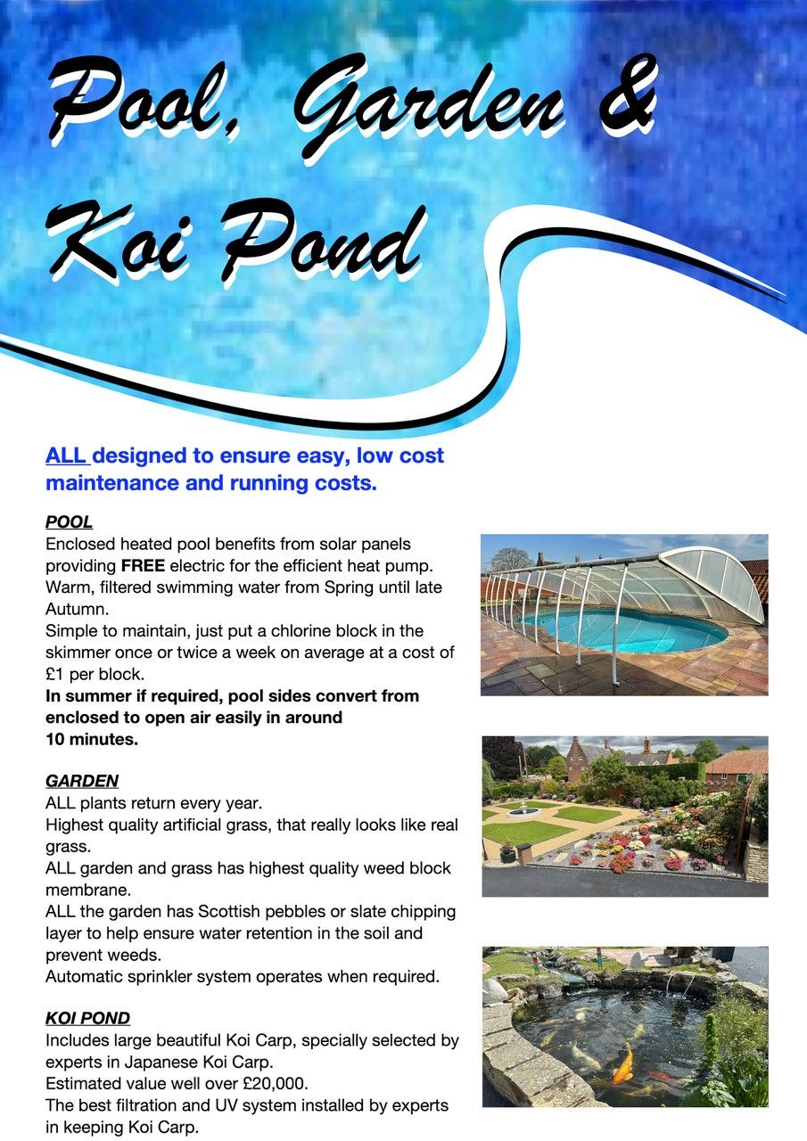 - The landscaped gardens include water features, Koi carp pond, well stocked borders and artificial grass