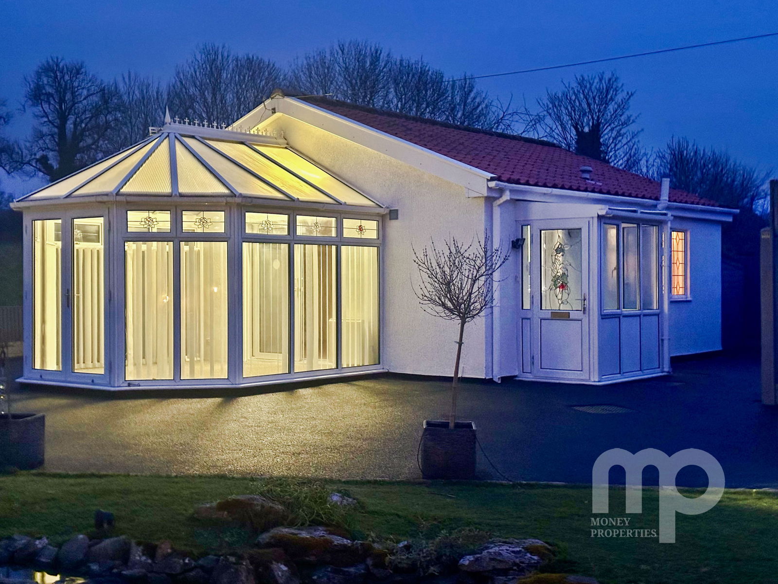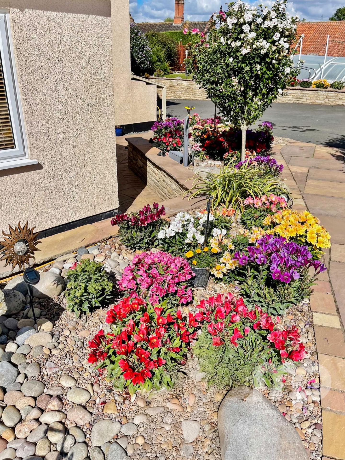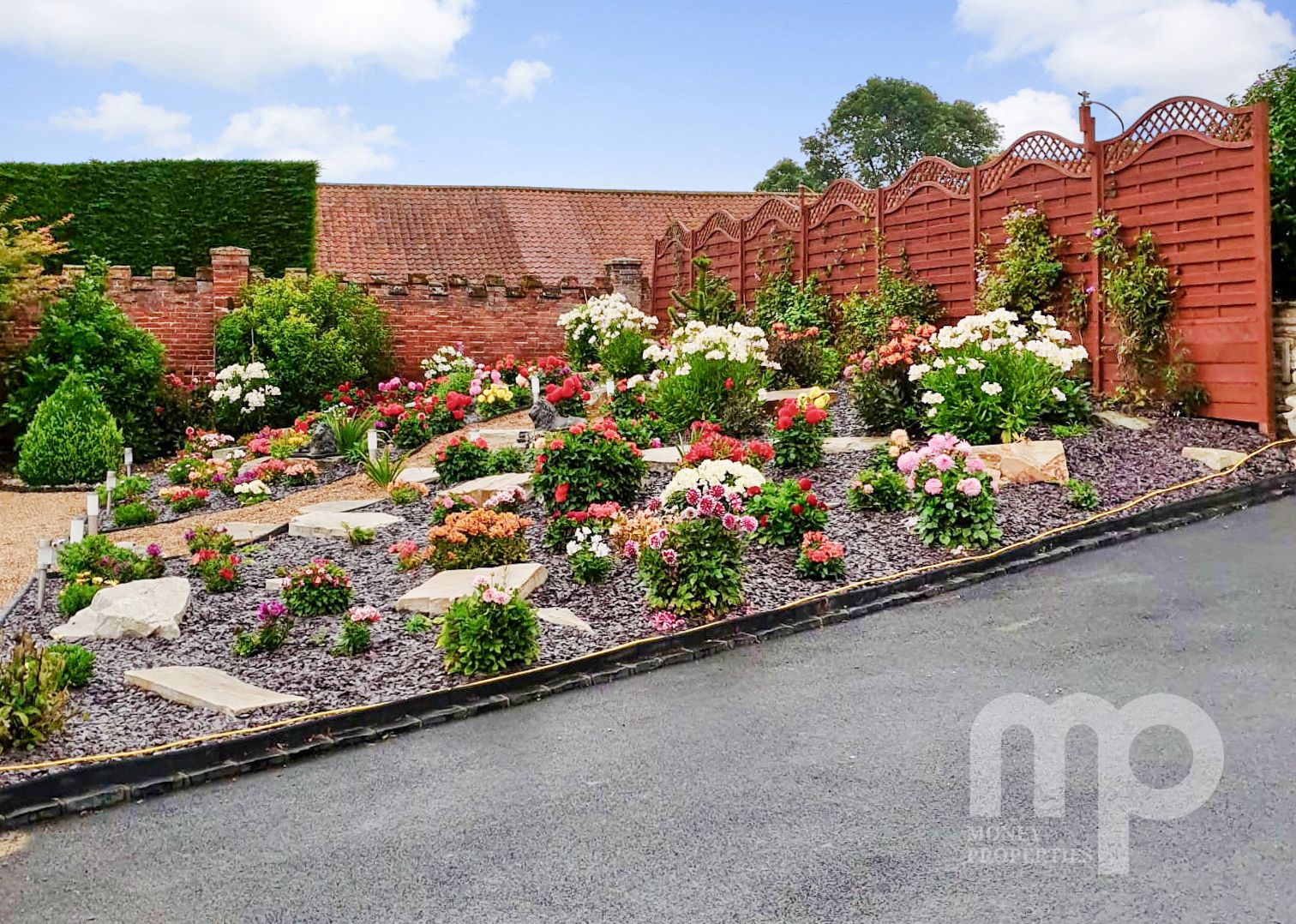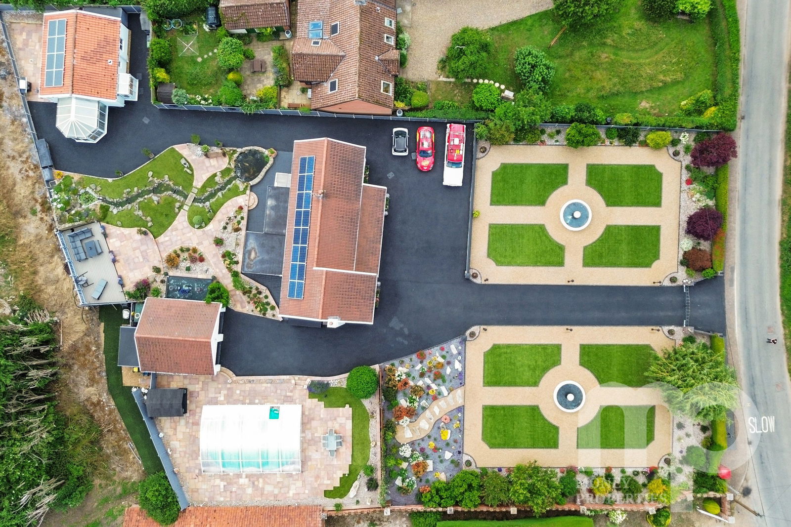 - The landscaped gardens include water features, Koi carp pond, well stocked borders and artificial grass