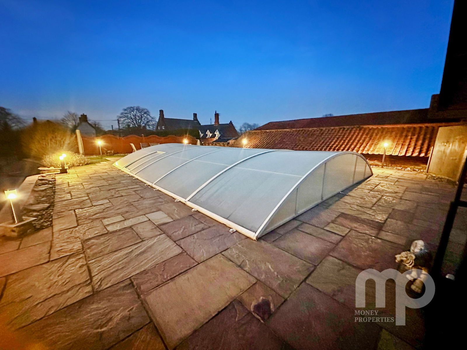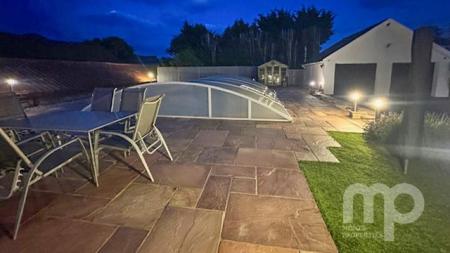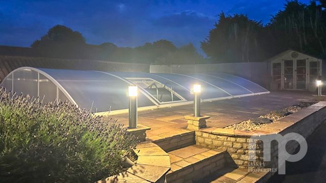 - A double garage with electric doors and a covered heated swimming pool make up outside space
