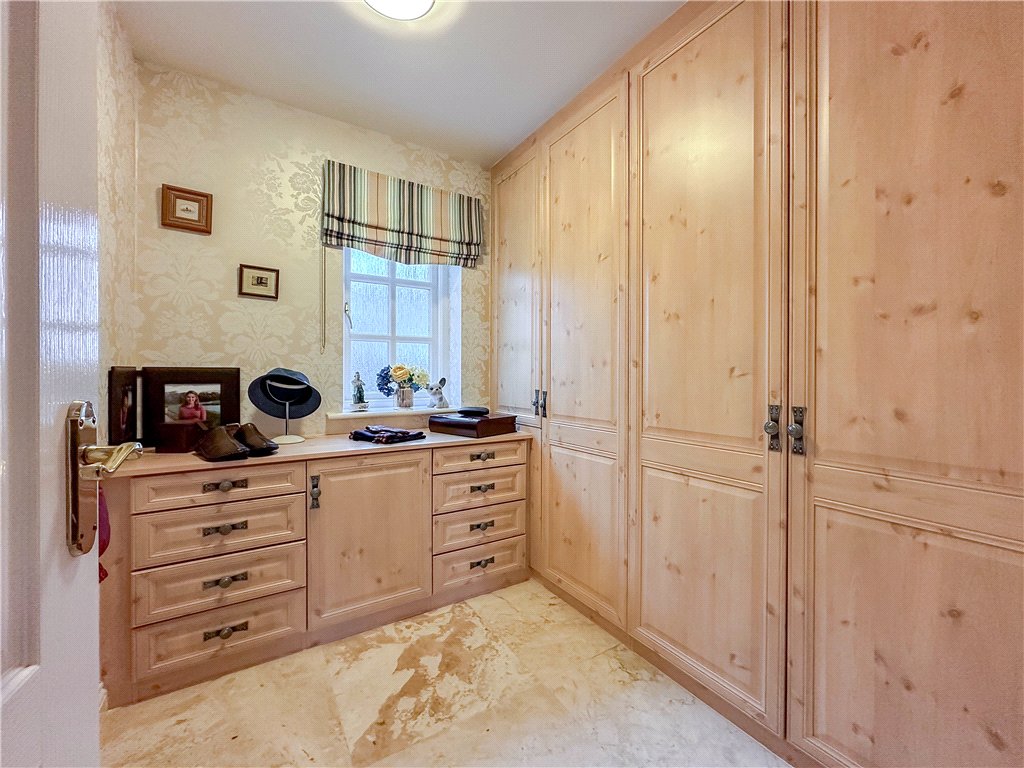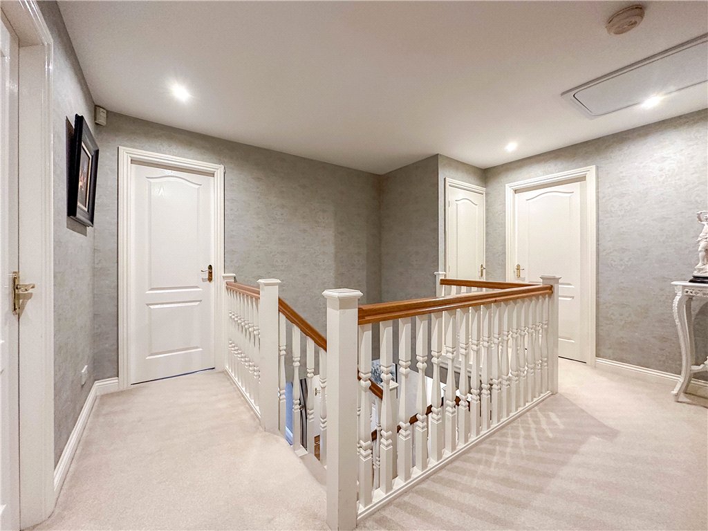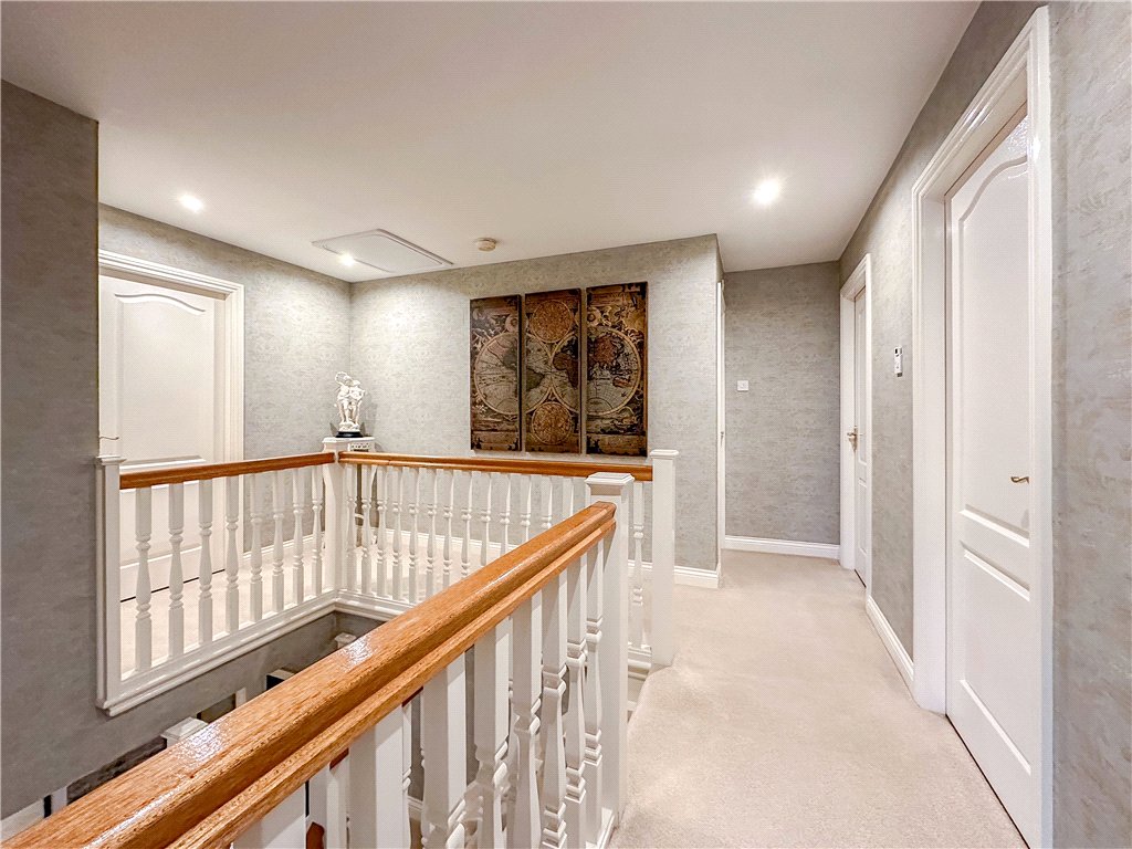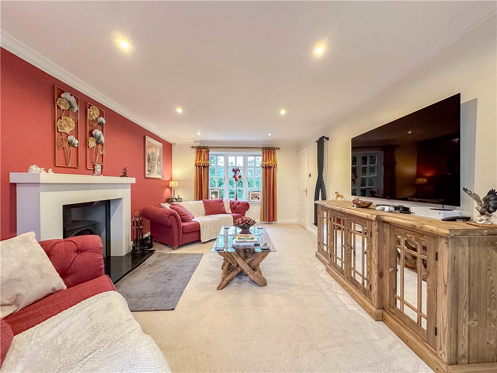 Externally, there is an extensive block paved driveway to the front of the property, with a lawn garden and mature boundary hedging. There is a detached double garage which has an external staircase that leads to a spacious room above that could have a variety of uses such as an office, gym or games room. The private rear garden features an extensive lawn, woodland, Indian stone patios, established pond and a rear decked seating area.