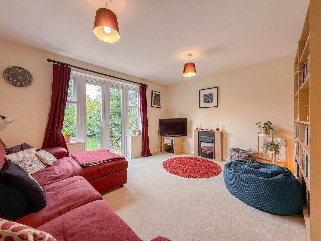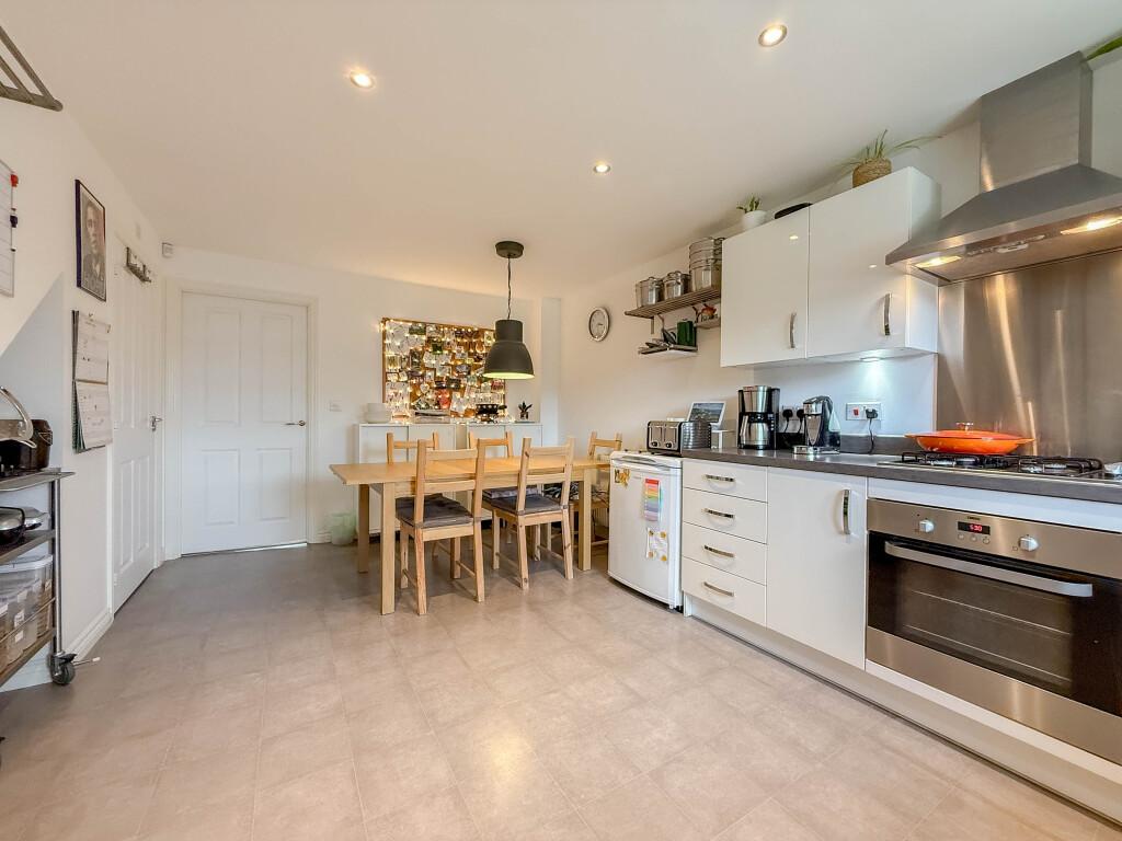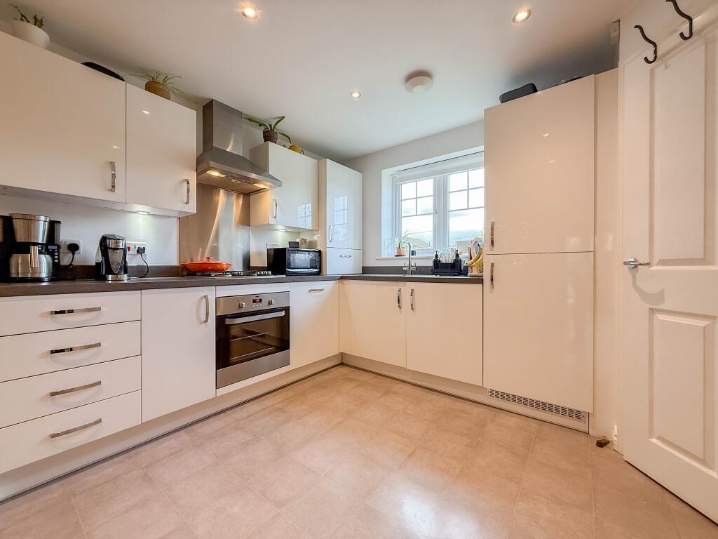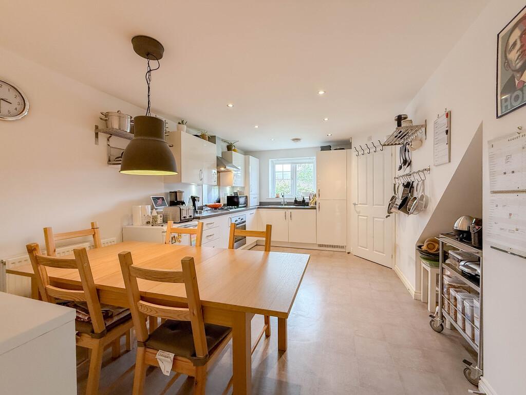 The property opens with an entrance vestibule leading through to a generous kitchen/diner, fitted with sleek high gloss units and a full range of integrated appliances including oven, hob, dishwasher, washing machine and fridge/freezer. To the rear, the lounge enjoys garden views and features French doors opening onto the patio and lawn. A convenient ground floor W/C completes this level.