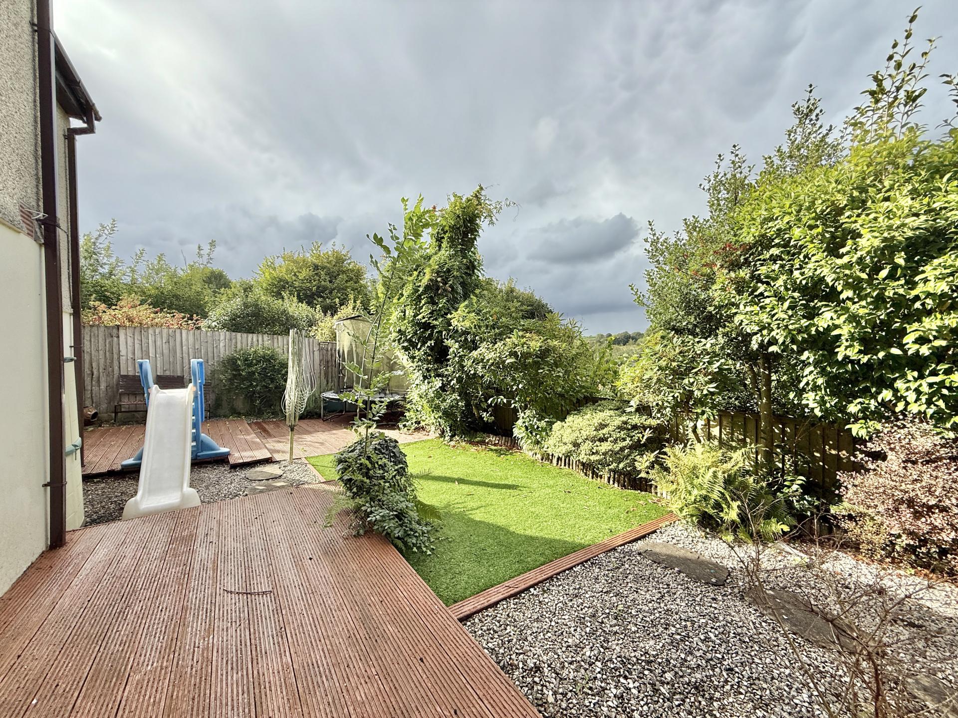 The gardens are fairly low maintenance, with a mixture of decking, gravel and artificial grass. There are some mature shrubs and trees with paths to both sides of the house and a stone circle for a seating area. There are flower beds at the front of the house with an ample driveway for three cars, leading to a single garage with eaves storage and electricity.
