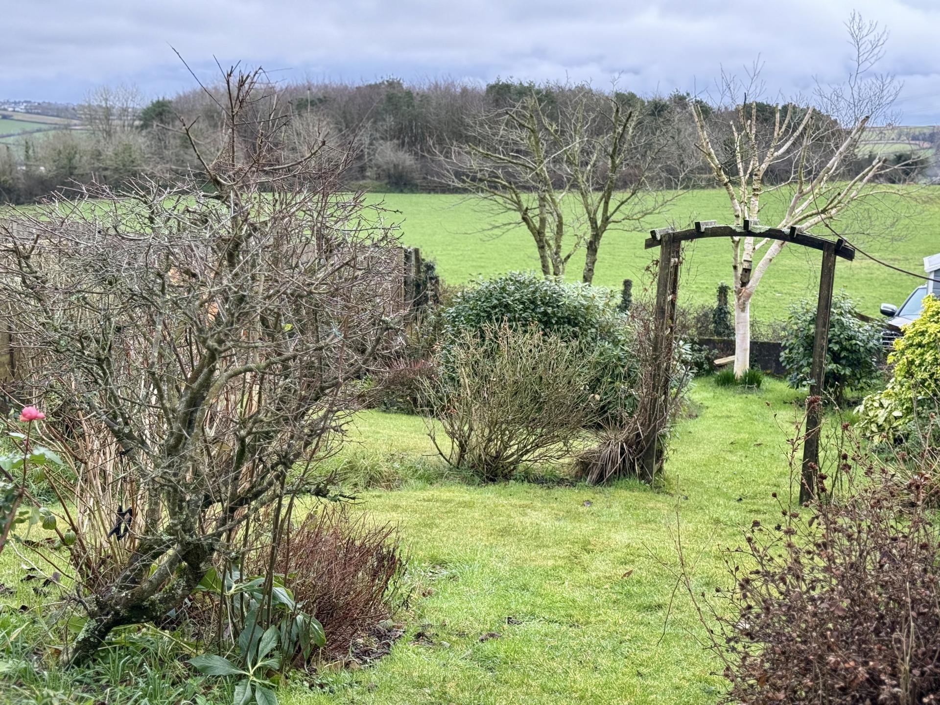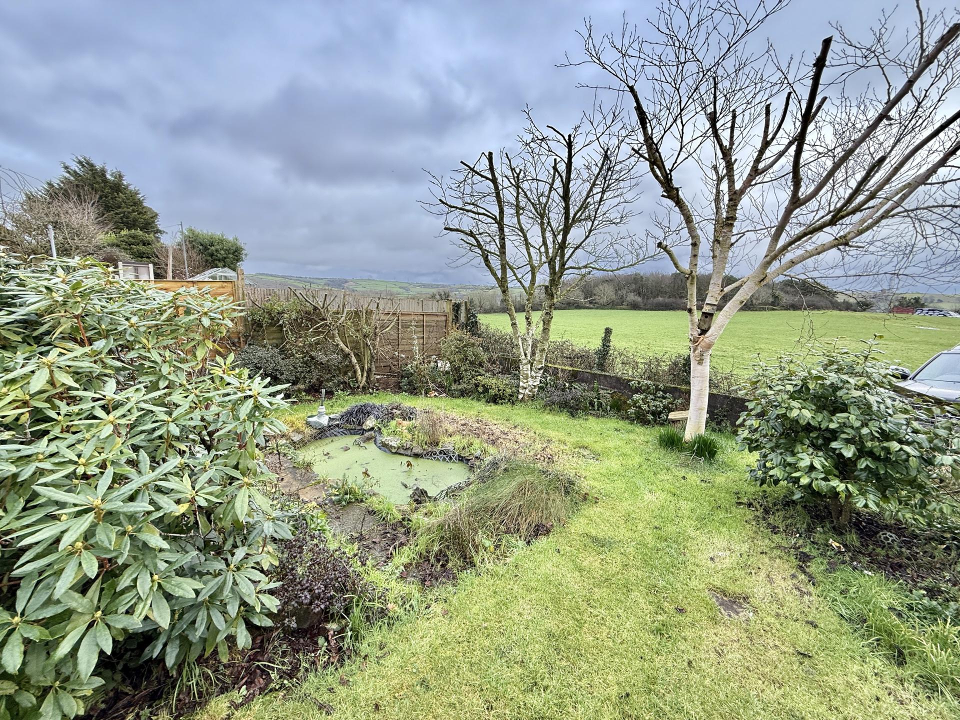 The property backs onto open farmland with a raised deck across the rear enjoying the views, steps lead down to lawn with mature shrubs and bushes, semi circular paved patio and pond.