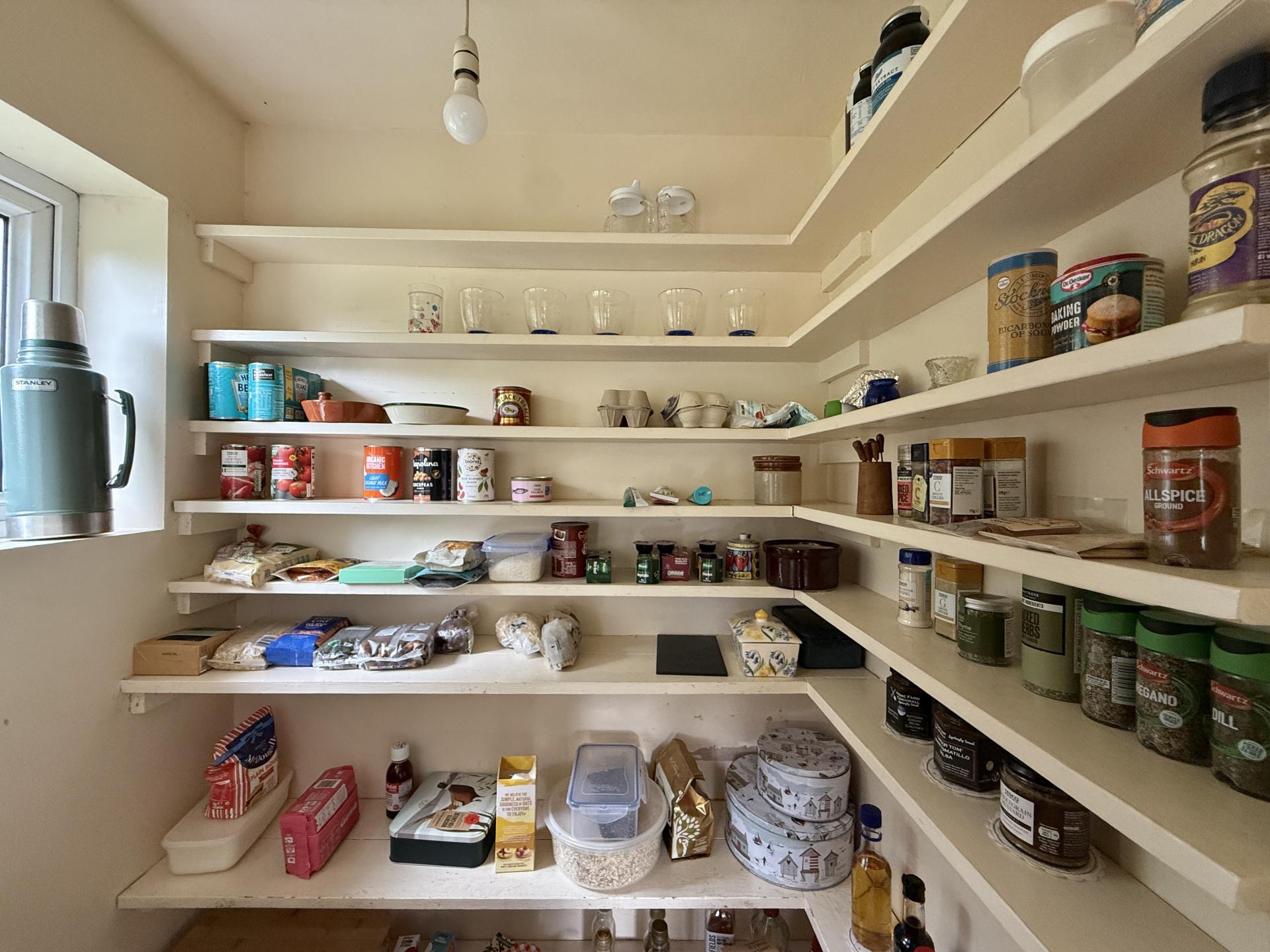 Bright and airy room with a good range of wood fronted base units and drawers under roll edge work surfaces, matching wall cupboards above tiled surrounds, inset enamel single drainer sink unit with mixer tap, plumbing for washing machine, space for tumble dryer and fridge/freezer, space for slot in electric cooker with cooker hood over, double glazed window to front and side, double airing cupboard with hot water cylinder and shelving, further storage cupboard, walk in larder with shelving and double glazed window to side, part glazed door to: