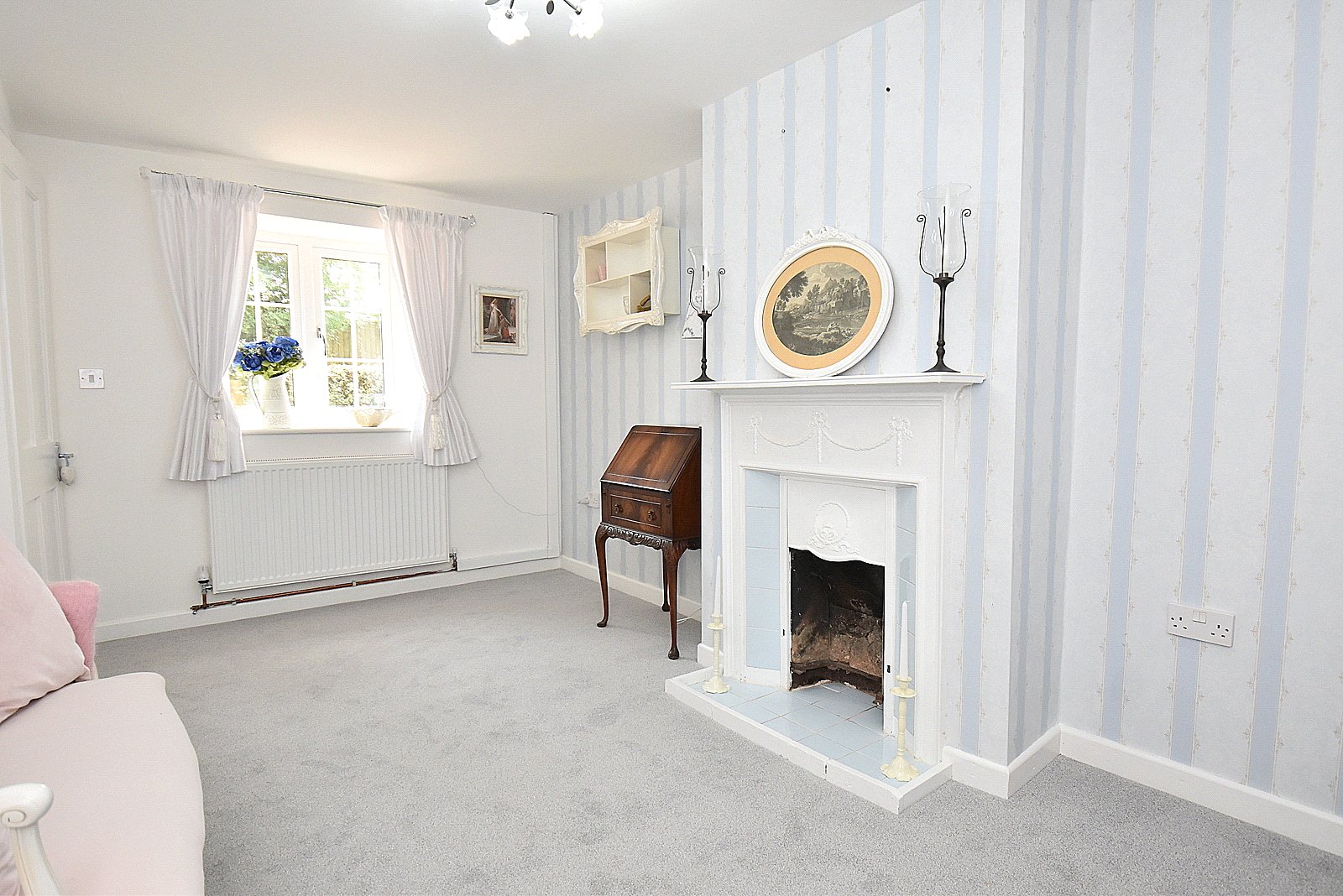 BEDROOM 3: 9’2” x 9’ (max) Radiator, smooth plastered ceiling, over stairs cupboard, period fireplace and double glazed window to front aspect with deep display window sill.