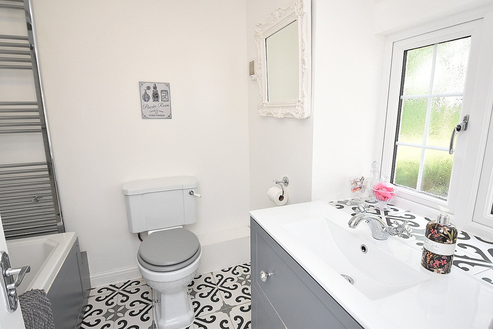 BATHROOM: Panelled bath with shower over, tiled to splash prone areas, vanity wash unit, low level WC, heated towel rail, smooth plastered ceiling and double glazed window to rear aspect.