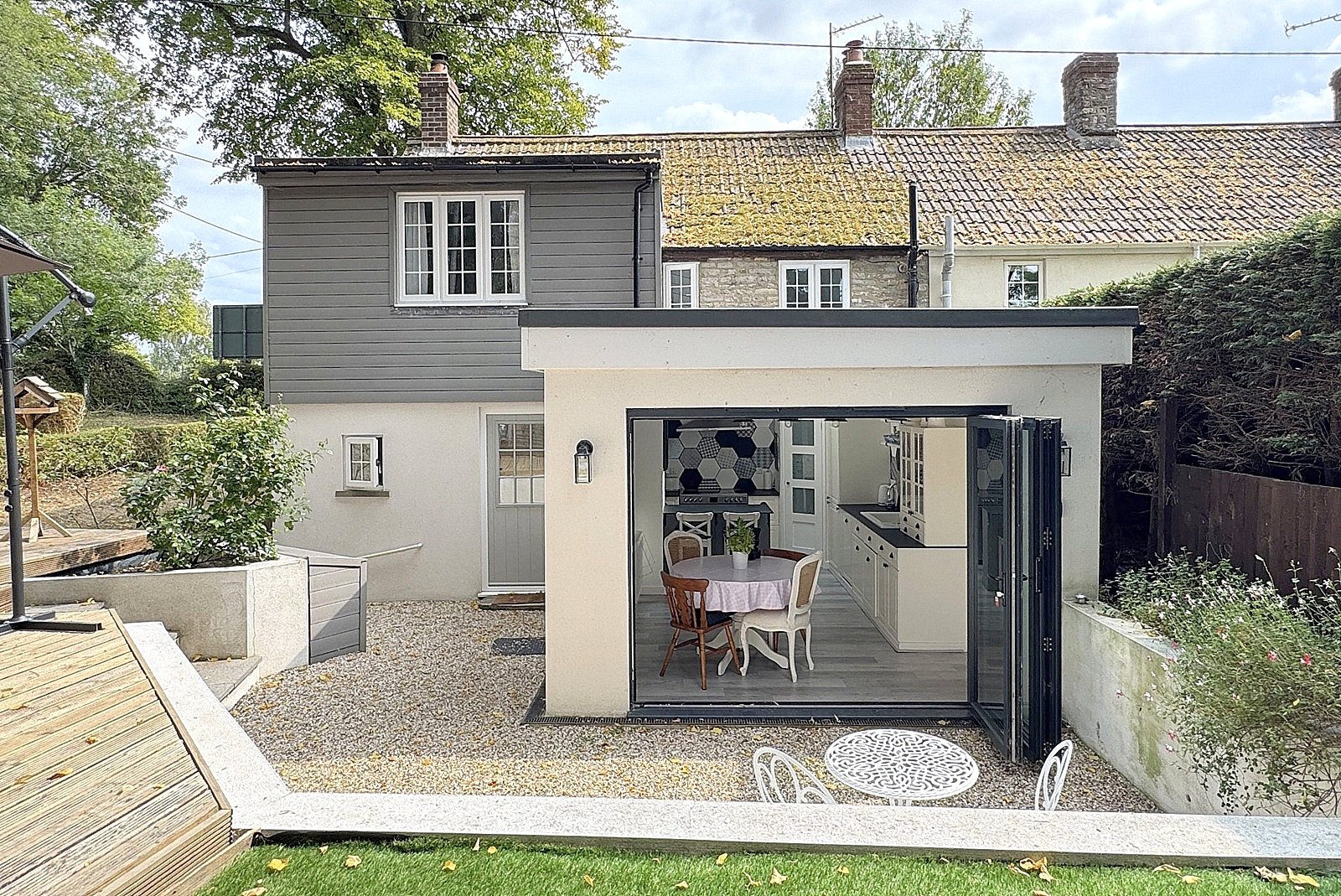 Outside, the beautifully designed garden has been cleverly landscaped creating distinct areas that combine gravel, lawn, and timber decking. Mature planting and established flora provide year-round interest and colour. A large terrace is the perfect entertaining area with space for outdoor dining.