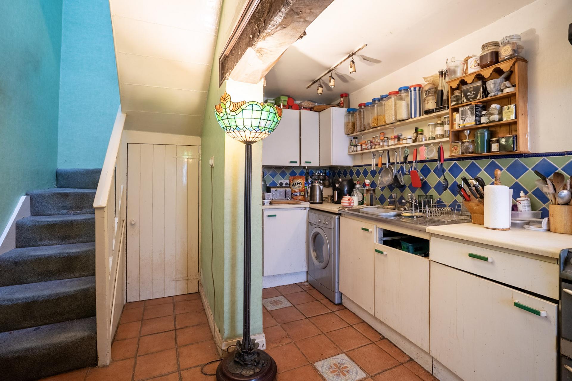 KITCHEN 4' 10" x 17' 10" (1.47m x 5.44m) Door to side. Range of fitted wall and base units with worktops, plumbing for washing machine. Space for freestanding electric cooker with extractor over. Stainless steel sink and drainer, tiled flooring.