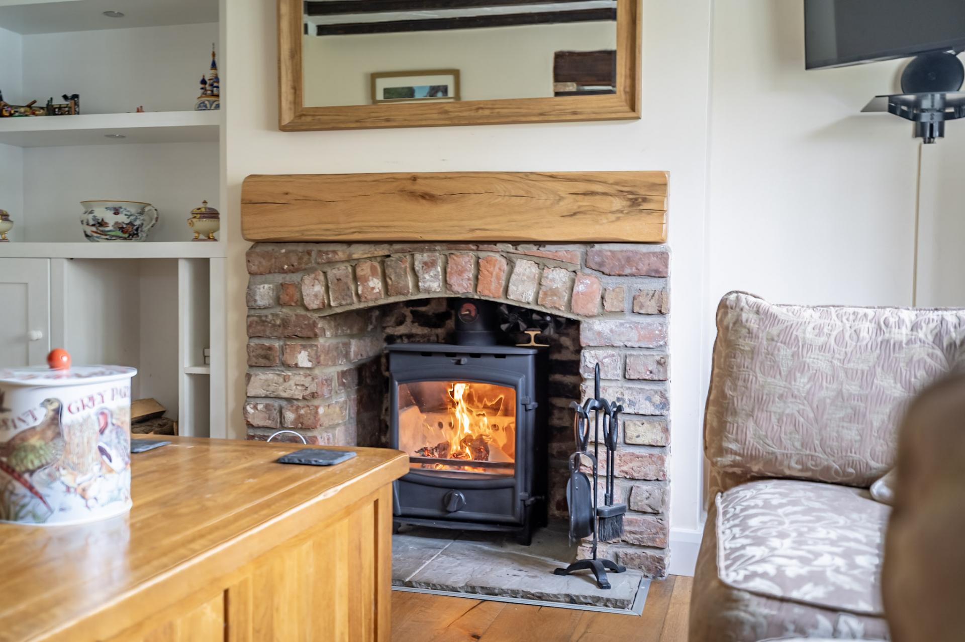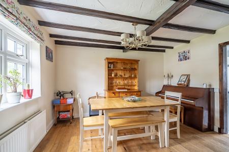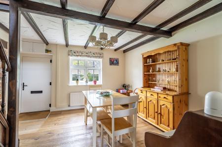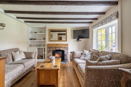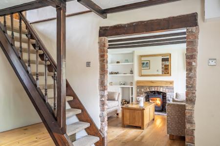 On entering you will see a central staircase to the first floor and to the right is a delightful sitting room featuring a log burning stove with bespoke shelving to one side and exposed beams to the ceiling. To the left is the dining room also with exposed beams and solid oak flooring which seamlessly brings the two reception rooms together.