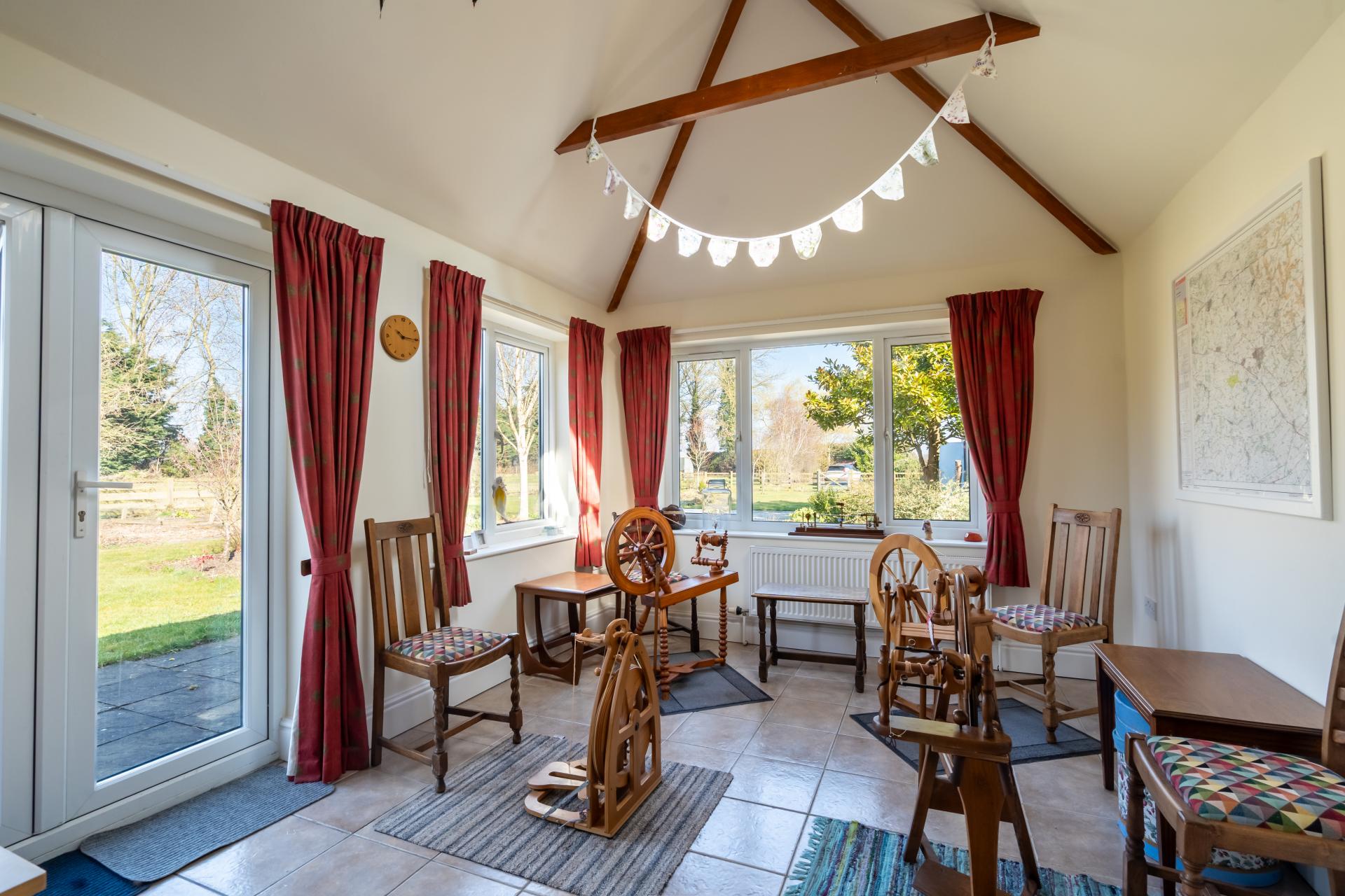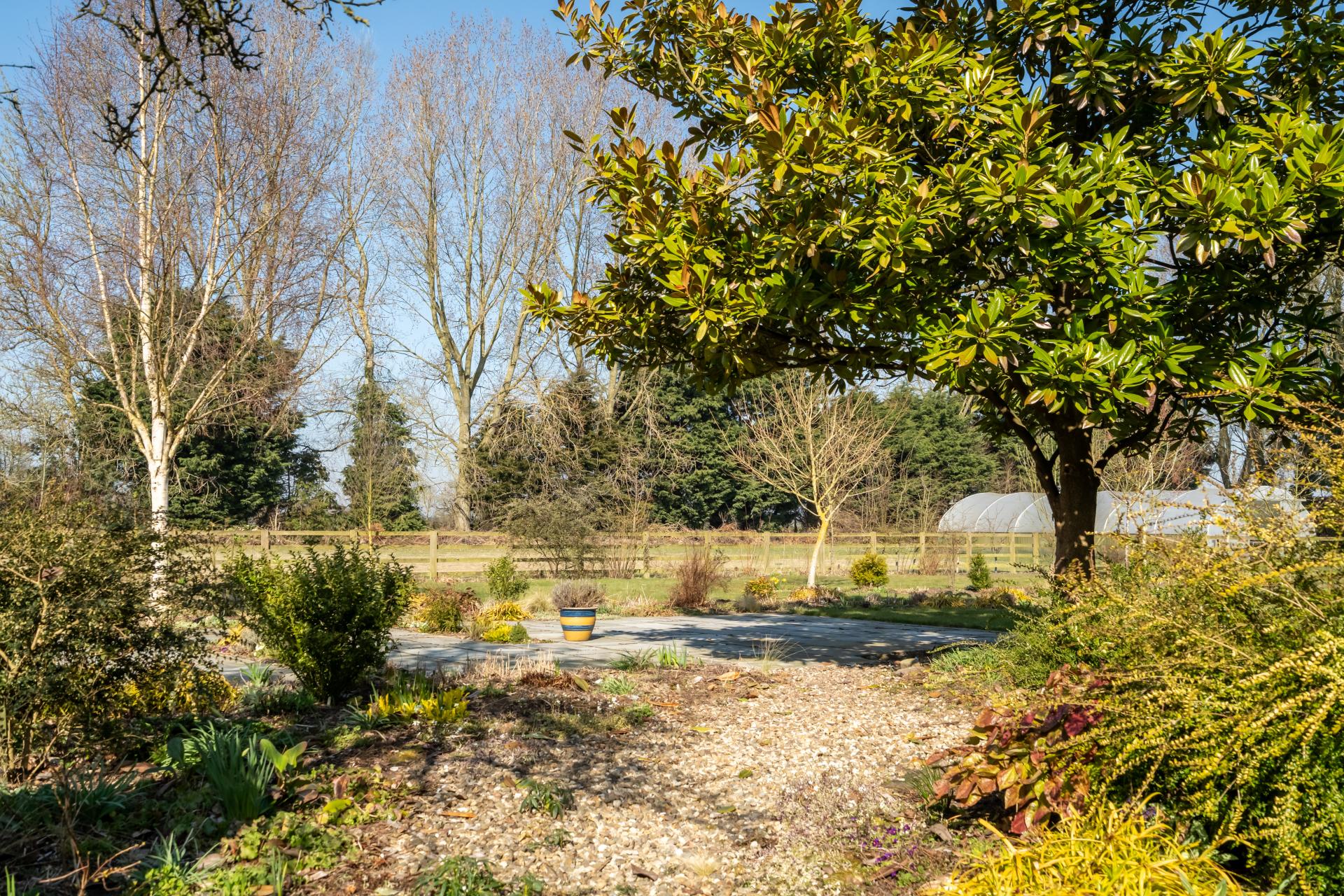Externally, the property offers a wealth of outdoor space with lots to explore. The present owners have a large paddock of approximately one acre which has a poly tunnel with water supply, several useful outbuildings, including a garage with power and lighting. There is also a dedicated dog paddock and beautifully landscaped gardens, featuring a charming gazebo seating area; perfect for enjoying the sunshine. The surroundings are further enhanced by a tree lined garden with pond and a woodland-style walk to the front of the property.