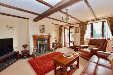 SITTING ROOM 16' 10" x 14' 4" (5.13m x 4.37m) Double glazed window to the rear aspect. Fireplace with log effect LPG stove. Wall lights, radiator, ceiling beams & double doors leading to:
