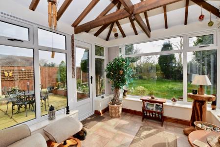 CONSERVATORY 10' 4" x 7' 8" (3.15m x 2.34m) Double glazed windows & single door leading to the garden. Ceiling beams, radiator.
