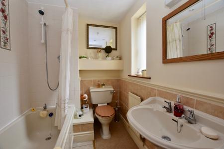 EN SUITE Suite comprising of a bath with shower over, pedestal basin & WC. Part tiled walls, recessed ceiling lights, radiator & double glazed window.