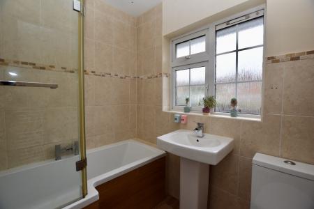 BATHROOM Window to rear aspect. White suite comprising P-shaped bath with shower over, WC and basin. Part tiled walls, recessed ceiling spotlights, extractor, chrome ladder style towel radiator.