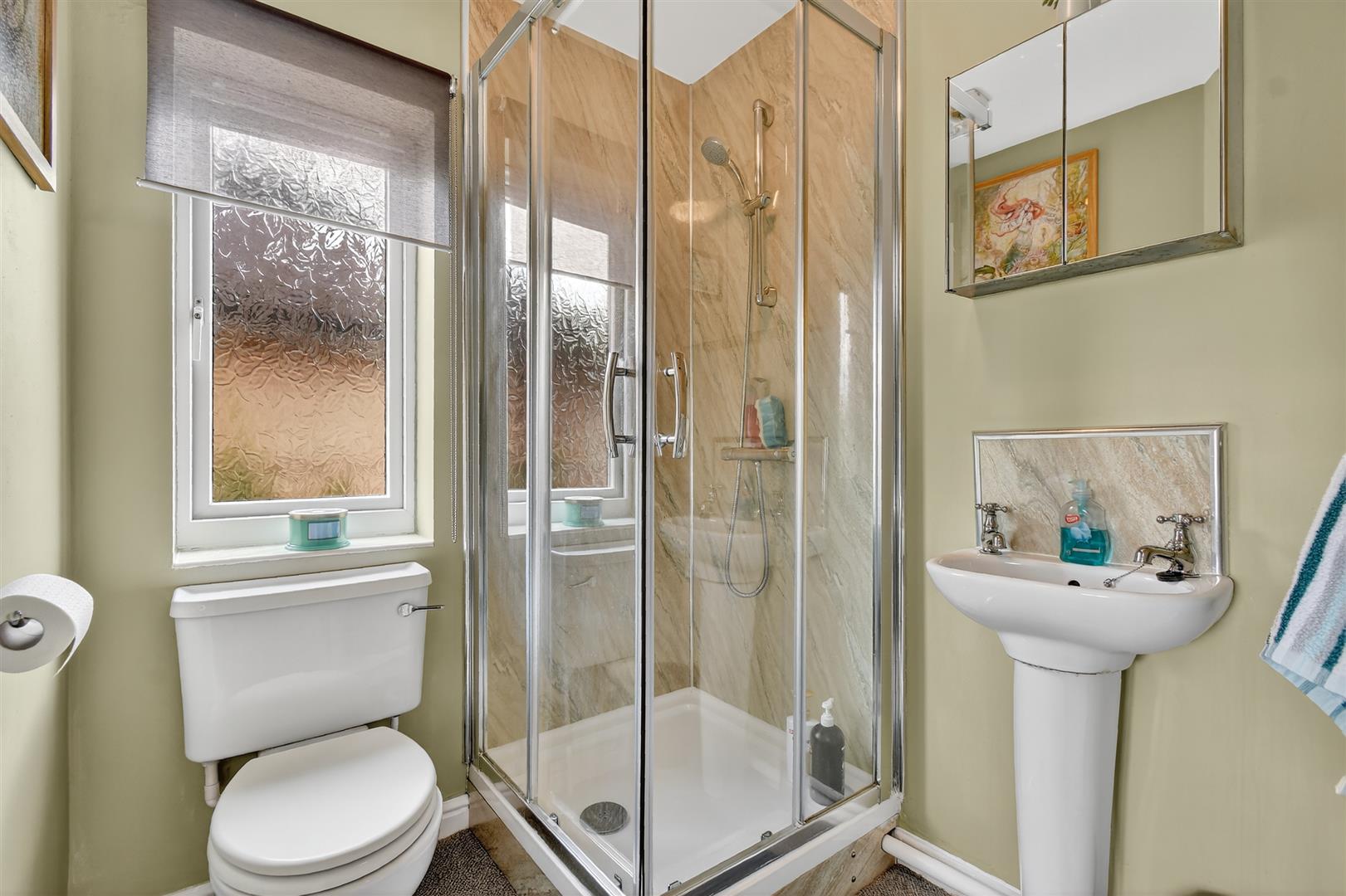 En-Suite - Opaque window to side, walk-in shower cubicle, pedestal wash hand basin, low level WC, double panelled radiator, extractor fan, carpeted flooring