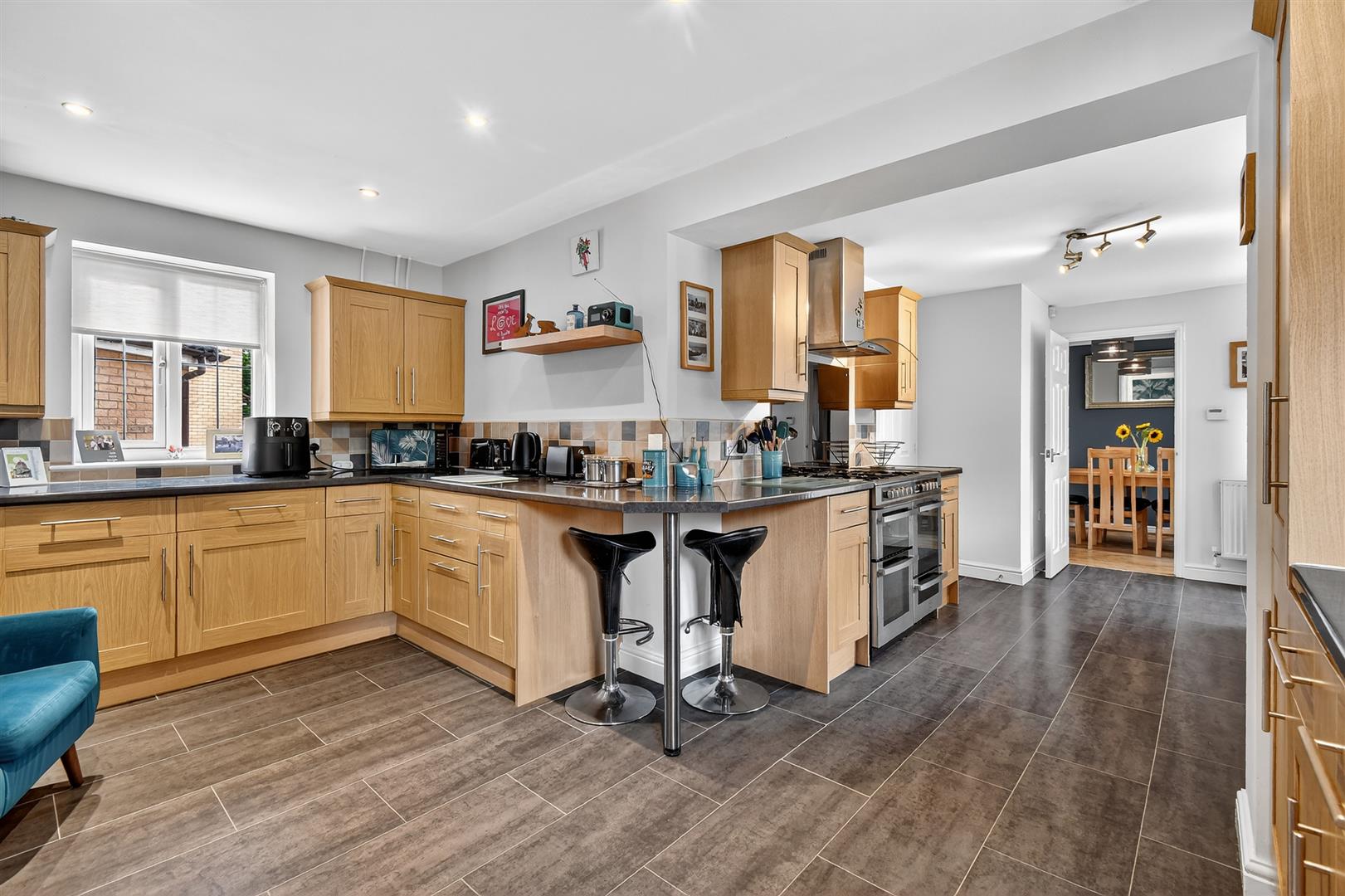 Kitchen - Fitted wall and base units with countertop, stainless steel sink and draining board, dual fuel range over, space and plumbing for appliances, integrated fridge/freezer, double glazed windows to front and rear, door to garden, power points, recessed spotlights, two double panelled radiators