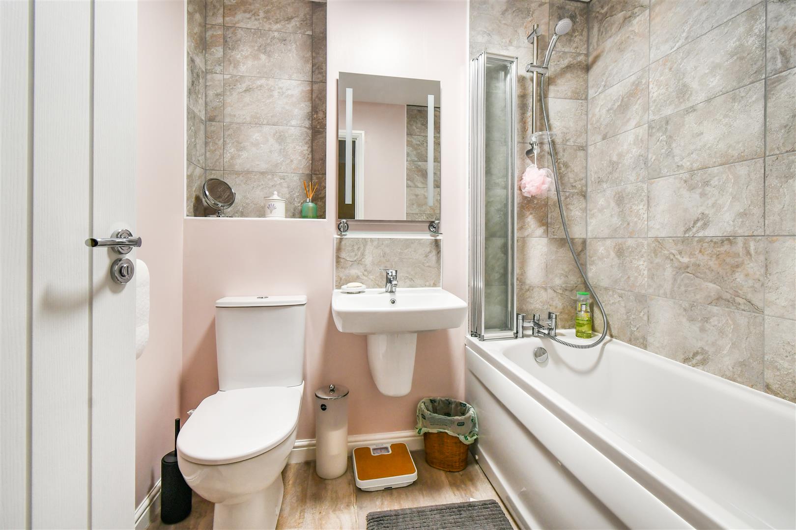 FAMILY BATHROOM - Upgraded tiling with a white suite comprising panelled bath with plumbed thermostatic controlled shower over, shower screen, wall hung wash hand basin, low suite WC, heated towel radiator.