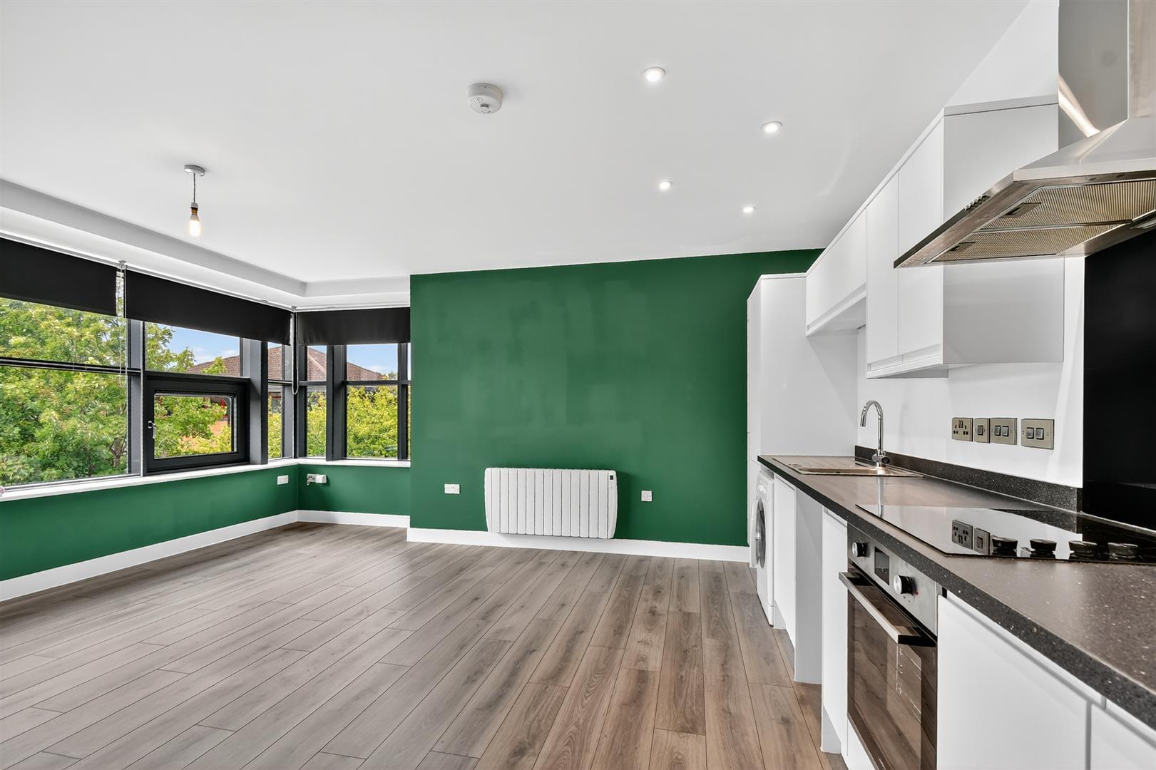 Open Plan Living Kitchen - Fitted wall and base units comprising counter top stainless steel sink and drainer with mixer tap, integrated oven and hob with extractor hood, built-in fridge freeze, plumbing for washing machine, power points, electric heater, double glazed window to side, TV point, power points. Hardwood flooring.