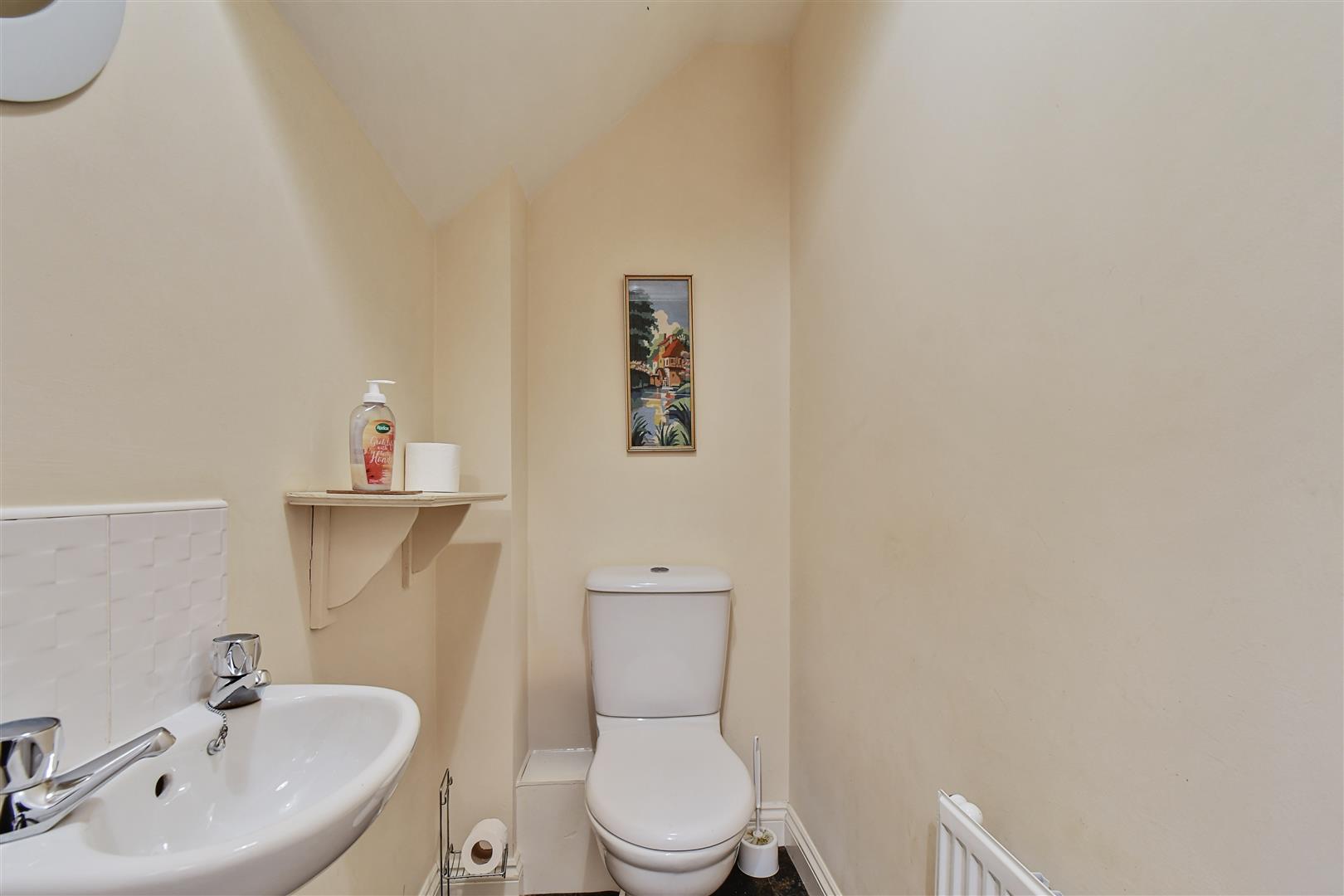 CLOAKROOM, white suite comprising low suite WC and wall hung wash hand basin.