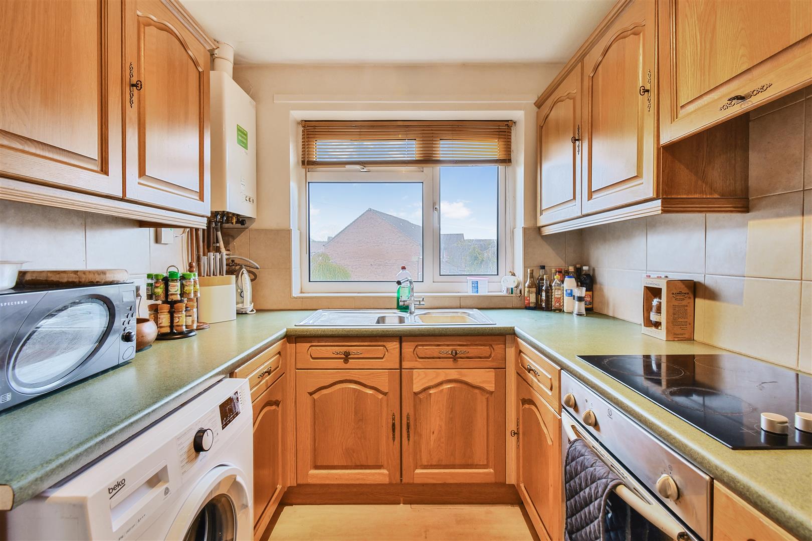 FITTED KITCHEN comprehensively fitted with a range of oak fronted wall and base units complemented by rolltop works surfaces and tiled mid range. Stainless steel sink with side drainer below a uPVC double glazed window to the elevation. Electric oven, electric hob with concealed extractor above, space and plumbing for a washing machine. Wall mounted mains gas boiler.