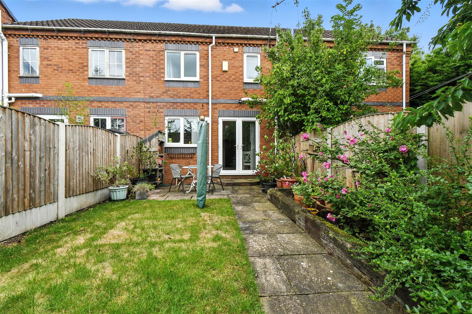 Outside - Small front garden, paved patio, lawn, flower borders, timber fence boundary, outside tap, gate to alleyway, two designated parking spaces