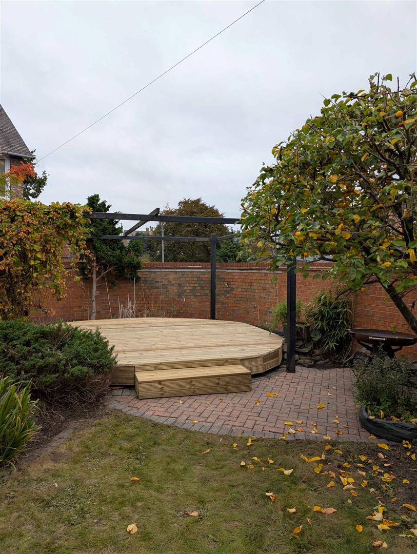 - Lawned Rear Garden With Patio, Timber-Decked Area And Mature Flower Border And Brick Boundary Wall