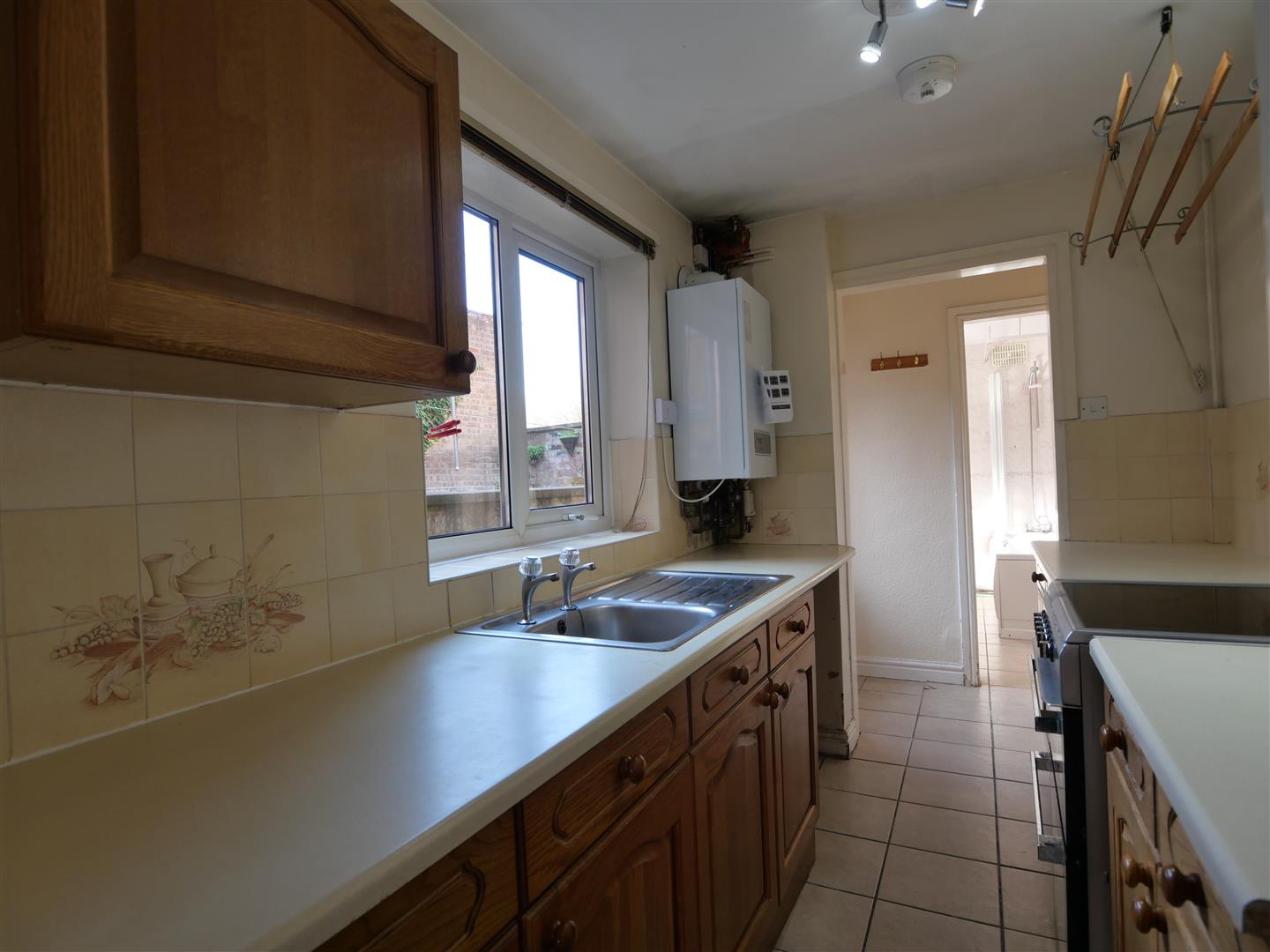 Kitchen - Window to side, wall and base units, countertop, stainless steel draining board, tiled flooring, wall mounted gas combination boiler, space and plumbing for appliances