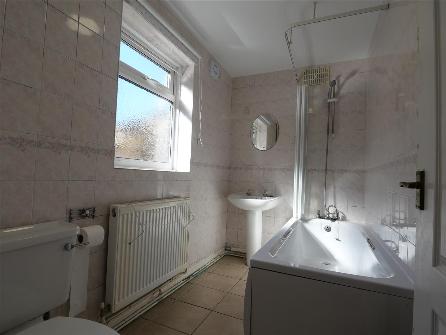 Bathroom - Opaque window to side, panelled bath with mains shower over, pedestal wash hand basin, low level wc, tiled walls, tiled flooring, extractor