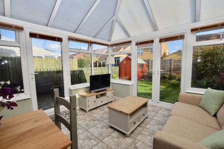 CONSERVATORY 10' 11" x 10' 7" (3.33m x 3.23m) French doors to rear garden, door to side, combination ceiling fan and light, tiled flooring, radiator.