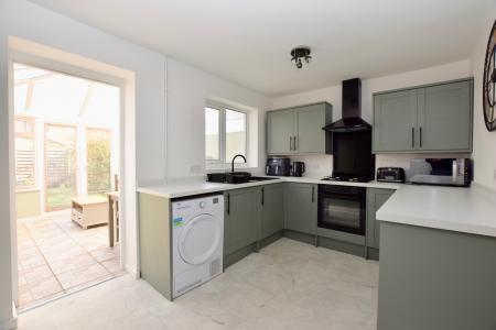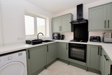 KITCHEN 8' 9" x 13' 6" (2.67m x 4.11m) Window to rear aspect. Range of fitted wall and base units with worktops, fitted fridge/freezer and plumbing for washing machine. Four ring gas hob with extractor over and electric oven below. Sink and drainer with mixer tap attachment, cupboard under stairs. Opening to;