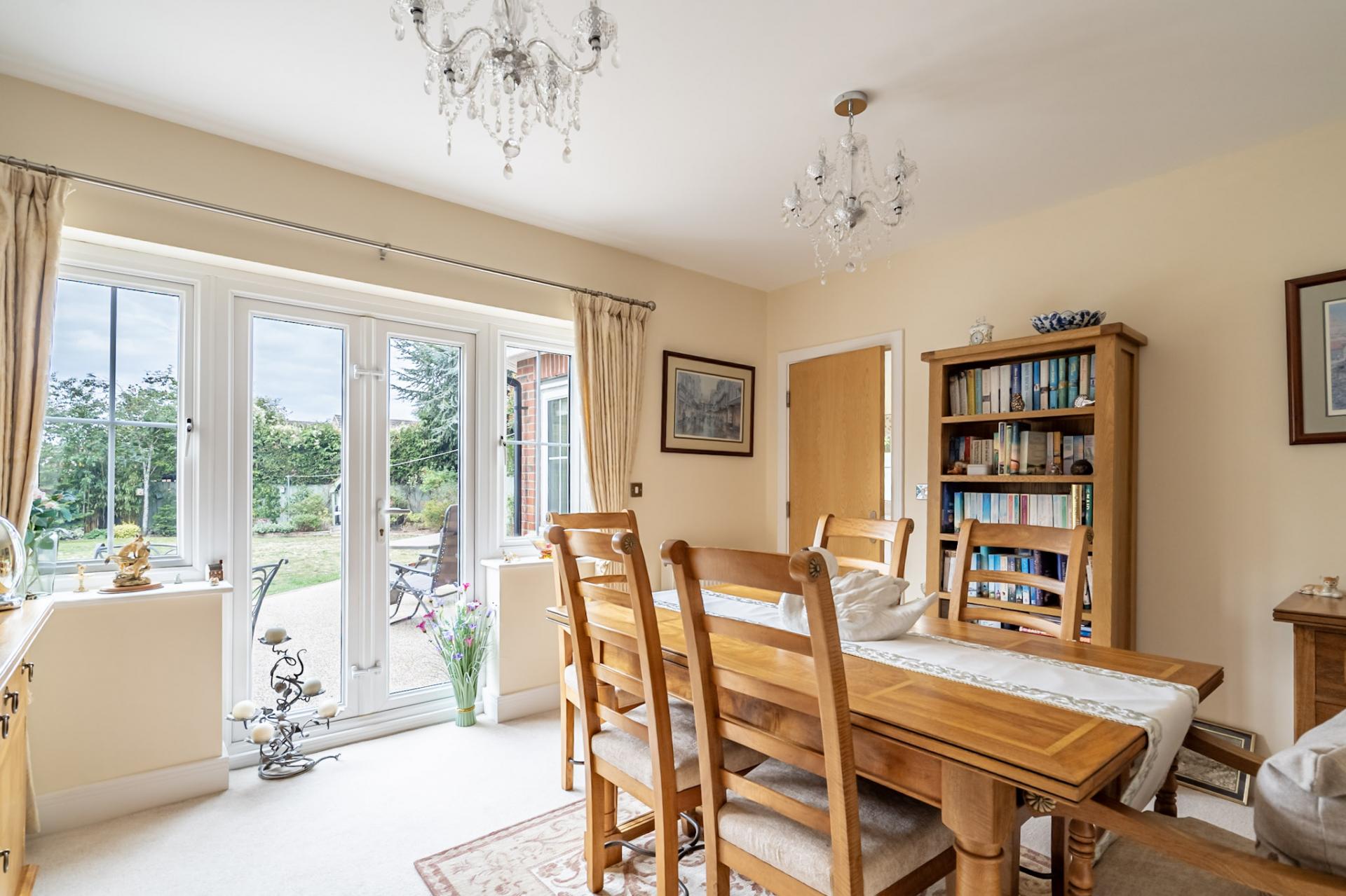 Outside, the west-facing rear garden is expansive with a large lawned area and sunny patio seating area, encircled with pretty planted borders. Overlooking the garden is a timber summerhouse, which is insulated and has light and power, allowing for a garden office or simply enjoying the garden throughout the year. To the front of the property there is a sweeping resin driveway leading to a detached double garage.